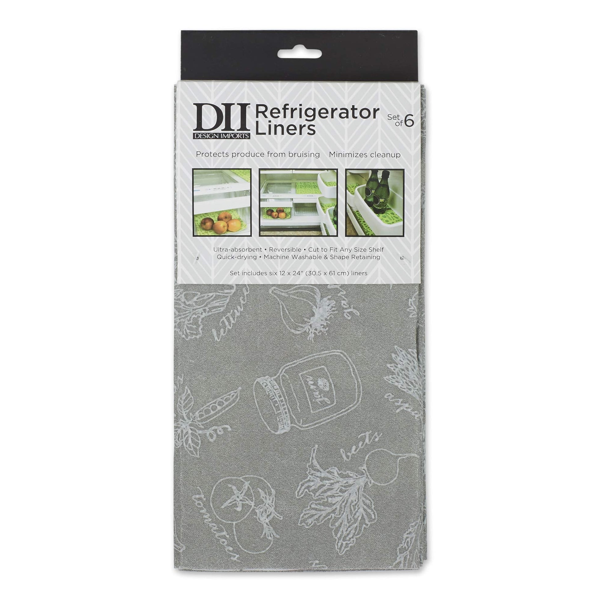Details: DII kitchen non adhesive, smooth top, cut to fit and washable Refrigerator liner rolls, Set of 6, 12 x 24-Inches are the perfect fridge liners. DII brings you reversible fridge liners to keep your stored items & shelves clean and protected. You will never have to wipe your protected surfaces again - simply throw your liners in the wash and reuse them. Made of 60% viscose and 40% polyester. Machine wash cold separately. Lay flat to dry. Do not bleach. Do not use fabric softener.