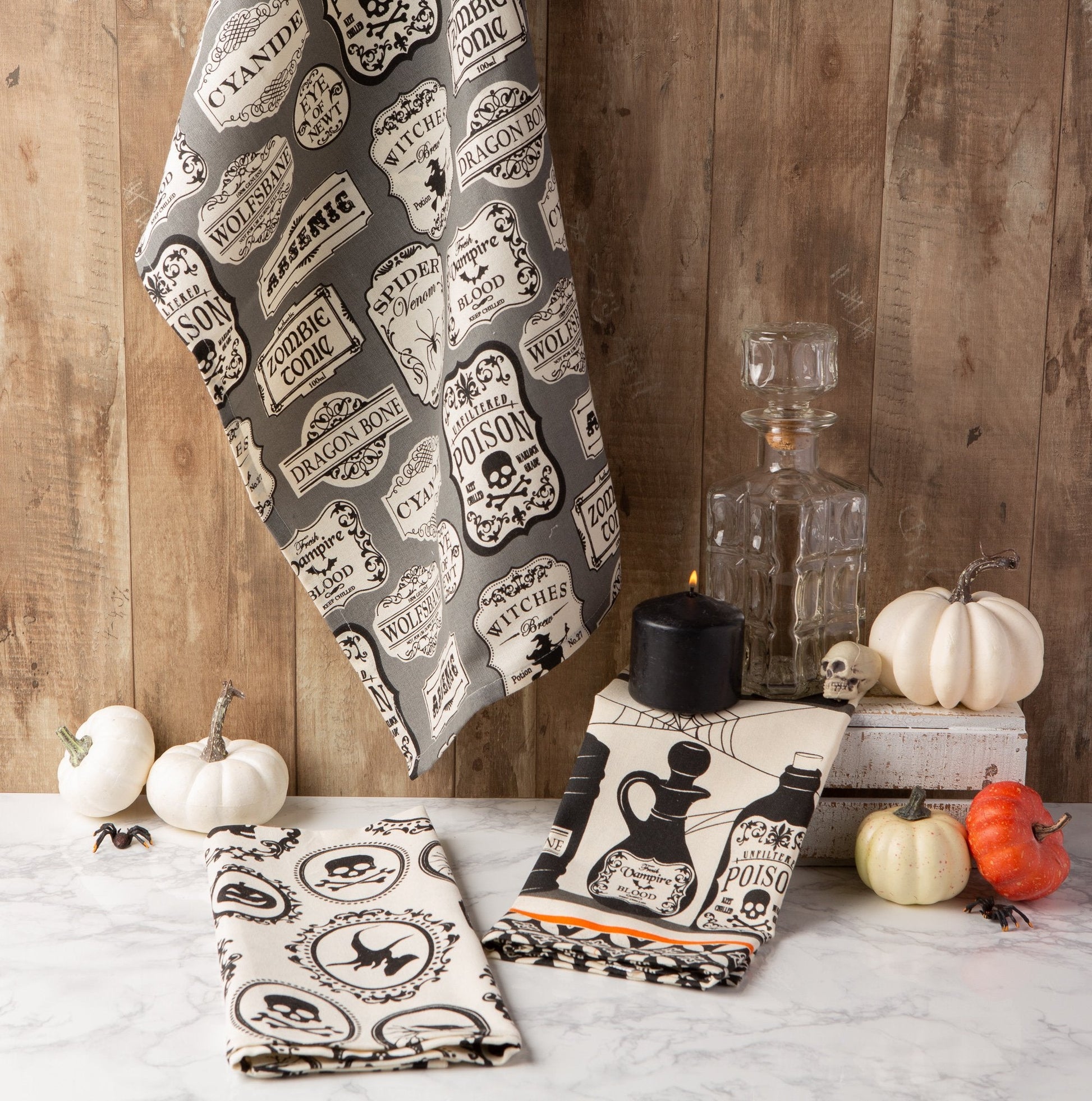 • FOR A FRIGHTFUL KITCHEN: 100% cotton festive dishtowels come in a set of 3 and measure 18x28' each; Perfect for scaring up some Halloween vibes