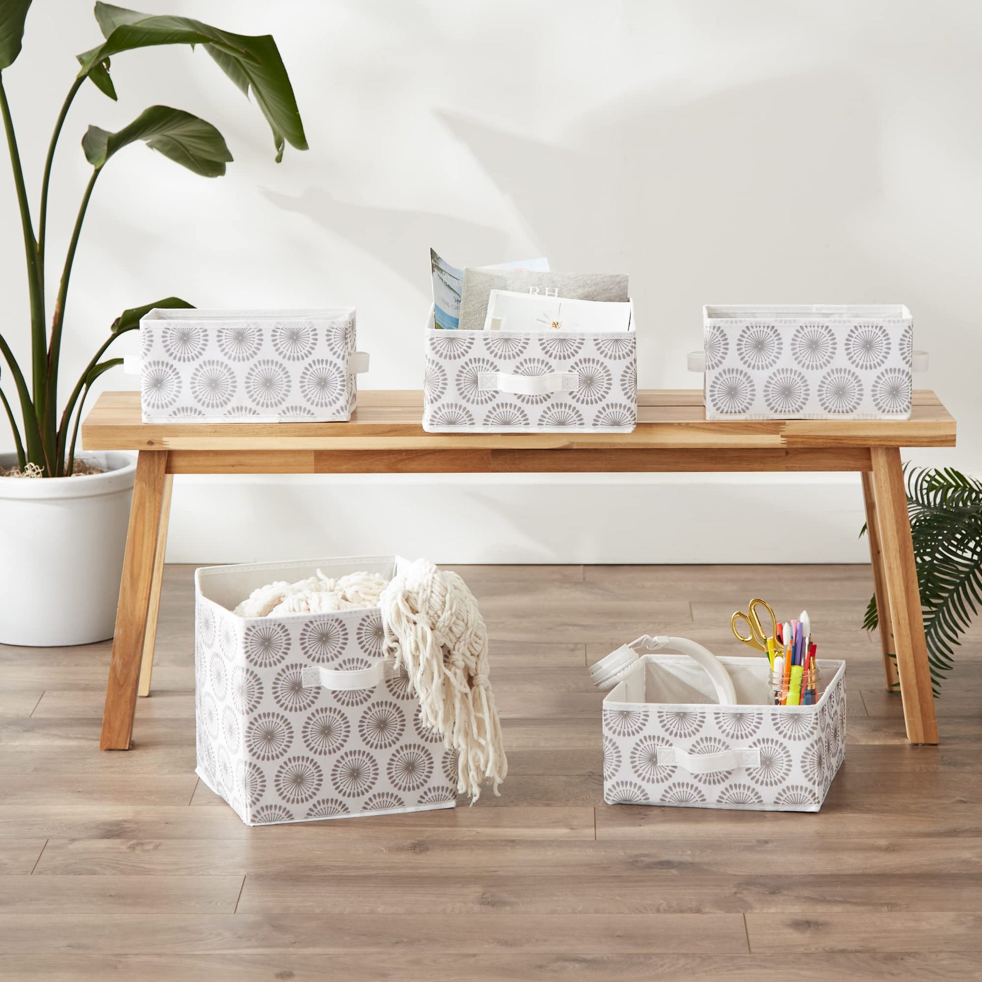 STURDY CONSTRUCTION: Non-woven fabric storage bins have cardboard sides and a removable bottom to give shape and add structure while still allowing bins to fold flat when not in use