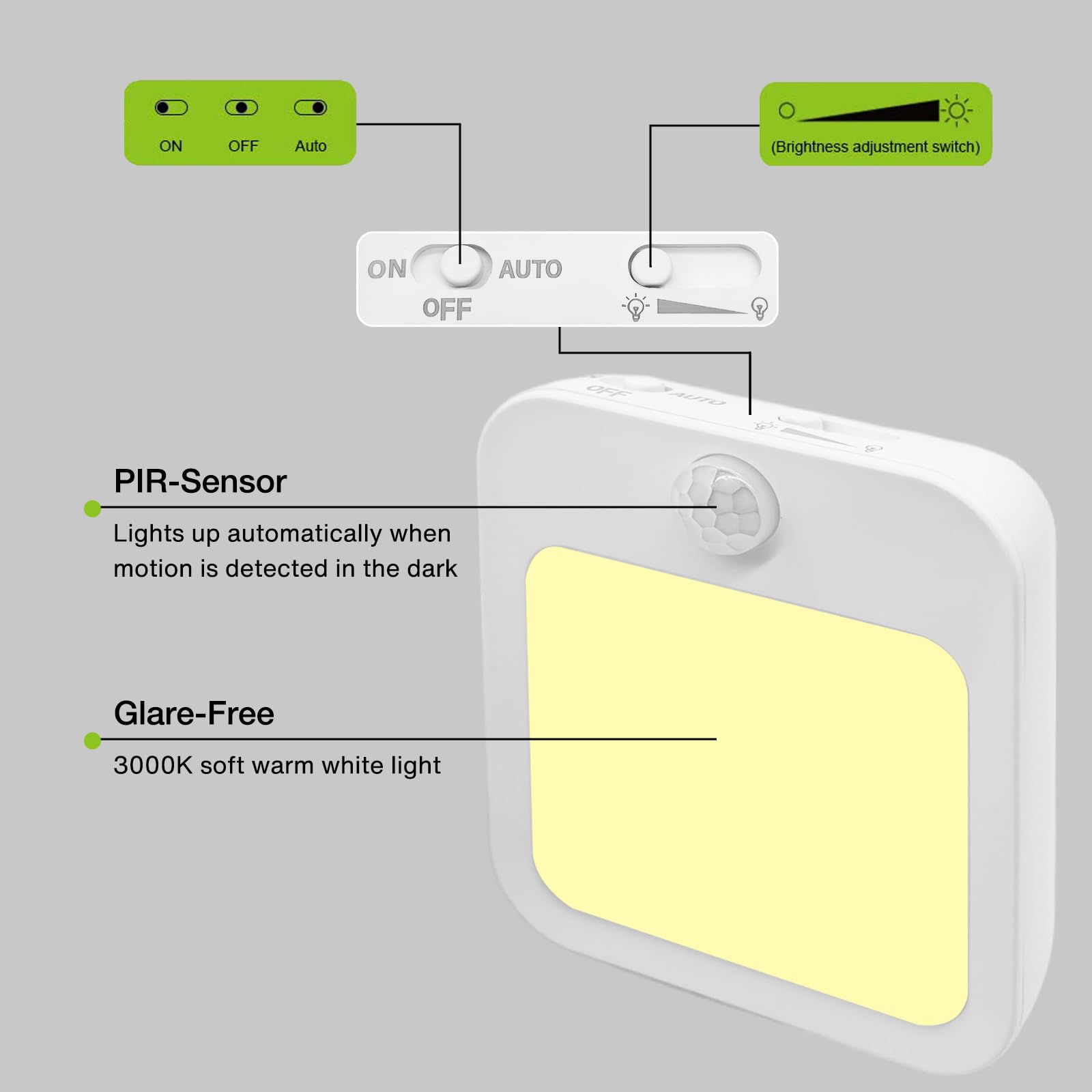 • ADJUSTABLE BRIGHTNESS CONTROL: Customise illumination between 0-20 lumens with dimming functionality to create your preferred lighting atmosphere, with 3 convenient modes - On, Off, and Auto