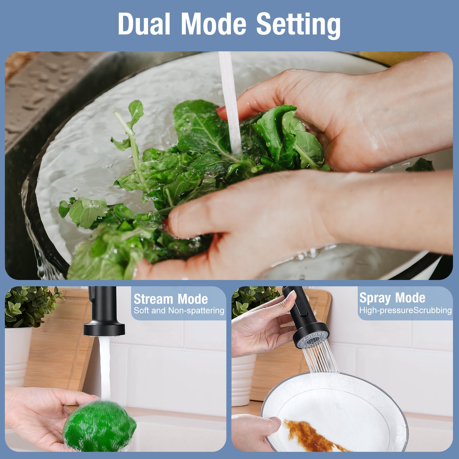 DJS Kitchen Faucets with Pull Down Sprayer Matte Black - Dual Mode Setting Single Handle 1 or 3 Holes Commercial Black Kitchen Sink Faucet with Deck Plate for Farmhouse RV Vessel Basin
