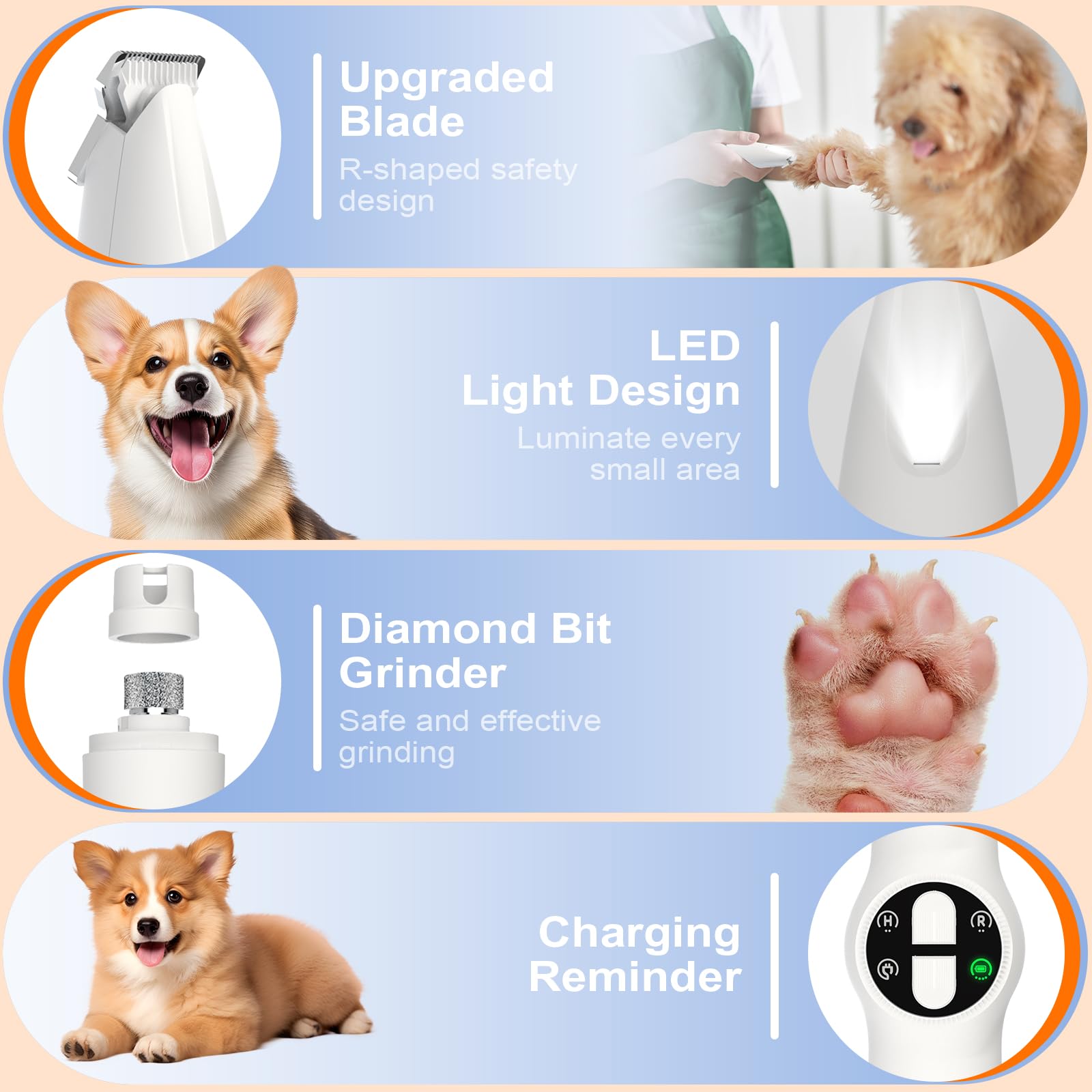 • 【LED Light and Smart Display】 This dog nail clippers for grooming is designed with LED lights to help you safely and clearly trim the hair of small parts of your pet, avoid over-trimming, and minimize damage to pets. Smart LED screen that clearly displays “Four” key statuses - Trimmer & Grinder Running Status, Fully Charged, and Charging Reminder.