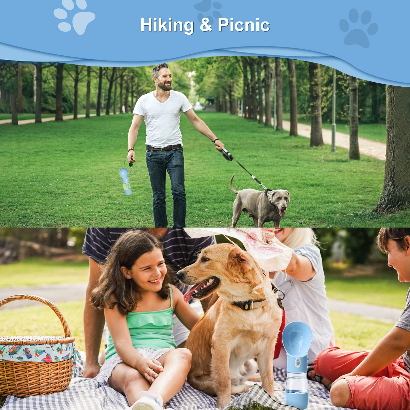 Dog Water Bottle with Food Container, Portable Dogs Water Dispenser, Outdoor Drink Bottles for Puppy, Cat, Pet, Essential Items for Travel, Walking, Hiking, Dog Accessories (Blue, with Food Container)