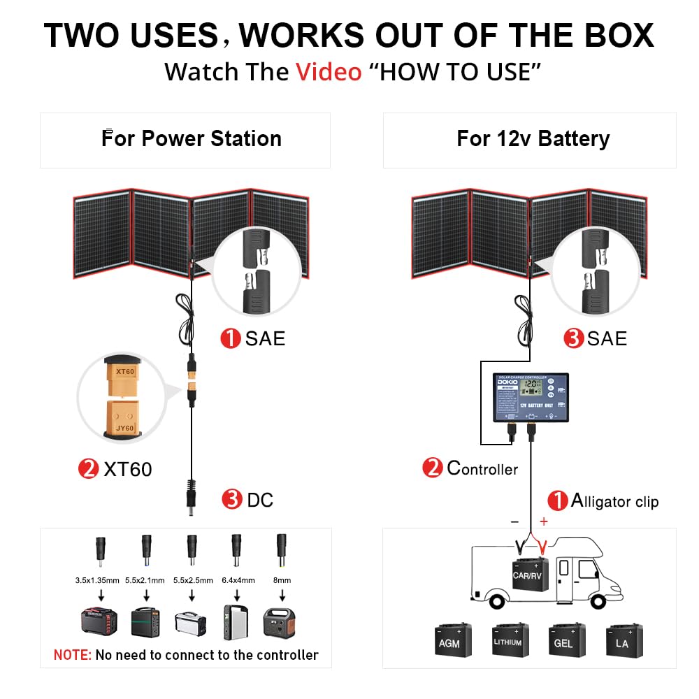 • 【COMPLETE BUNDLE IN ONE PACKAGE】 Includes the foldable 150W panel, separate controller, SAE/XT60/Alligator clips, DC5521/5525/35135/6440 adapters, 9.84ft cable, storage bag, and manual—everything you need for quick setup