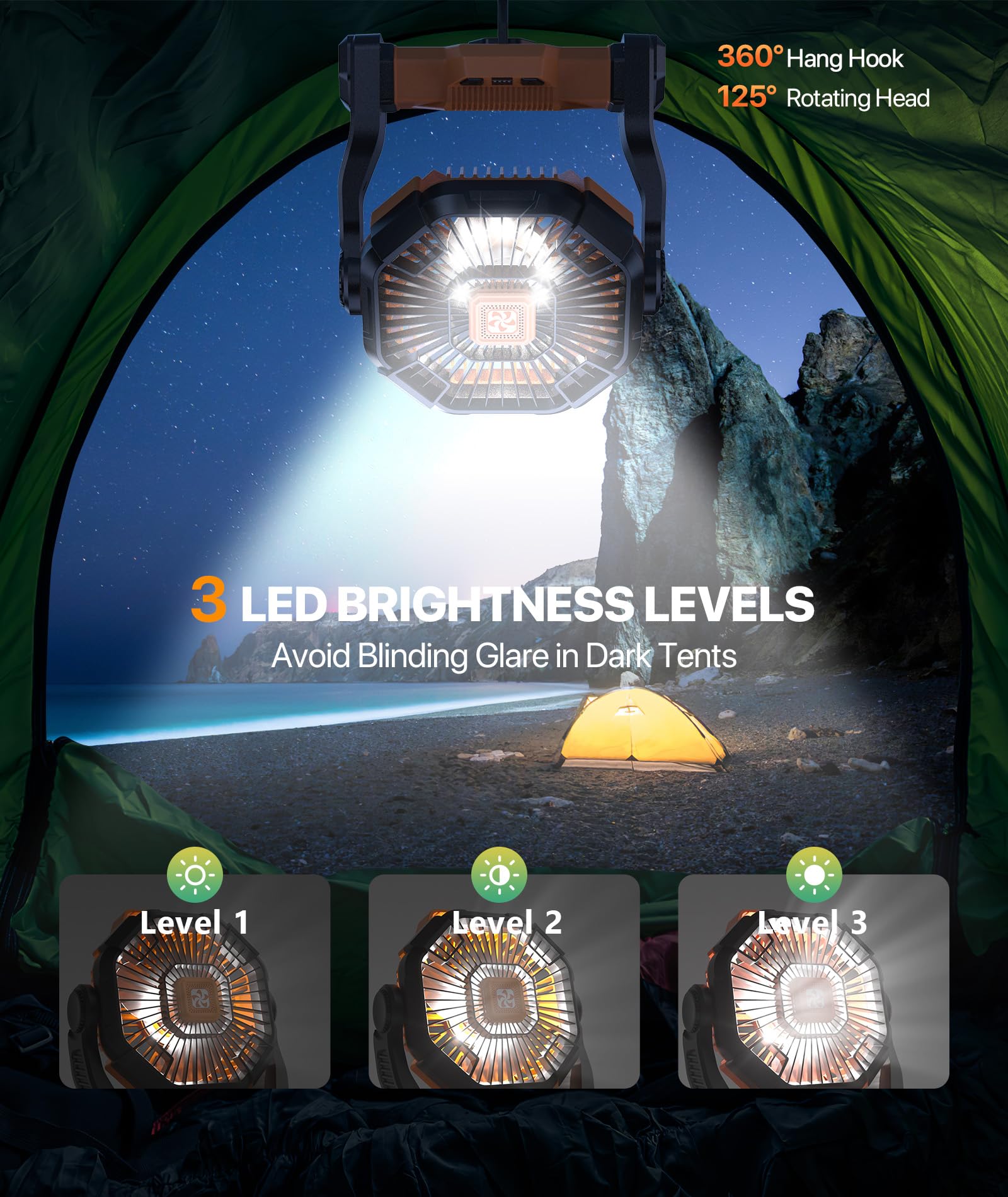 • [Super Bright Led Lights] Outdoor Battery Fan provided a soft and non-glaring light, protect your eyesight, enhance your nighttime use.It is ideal for fishing,camping, studying at night. The Camping fan with LED Lantern,featuring 3 brightness settings LED lantern, intended for satisfying your lighting requirement outdoor.