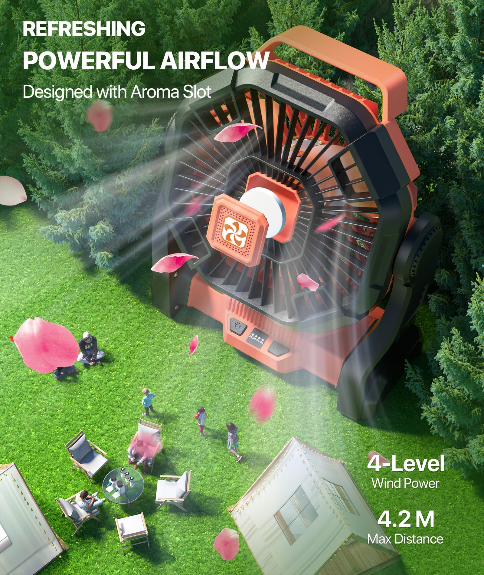 • [Portable Camping Fan With Hook]The outdoor portable fan for camping has a Hook that can rotate 360° rotation adjustment. You can hang the fan up and adjust the right angle. Hang it in a tent, tree branch, or vehicle. 270° rotation adjustment, more flexibility, enabling you to direct airflow precisely where it's needed, enhancing the overall comfort of your space and it standing up to the challenges presented by outdoor.
