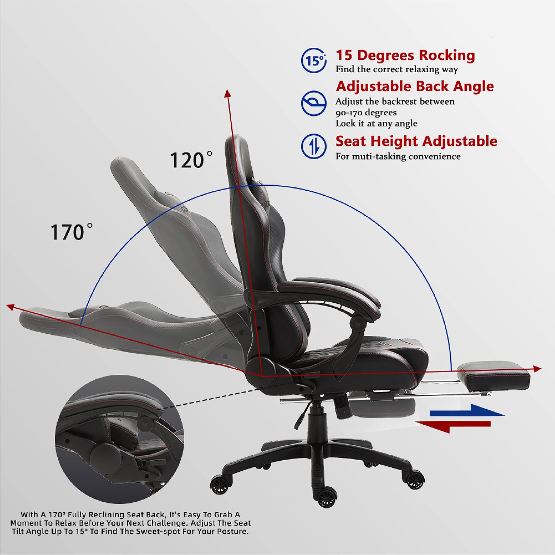 • Ergonomic with Adjustable Function: This ergonomic gaming chair offers complete relaxation with its multi-functional design that includes smooth 90°-165° reclining capability, a retractable footrest for full-body comfort, a gentle 20° rocking function, and a built-in massage lumbar pillow that effectively relieves back tension after prolonged gaming or computer work.