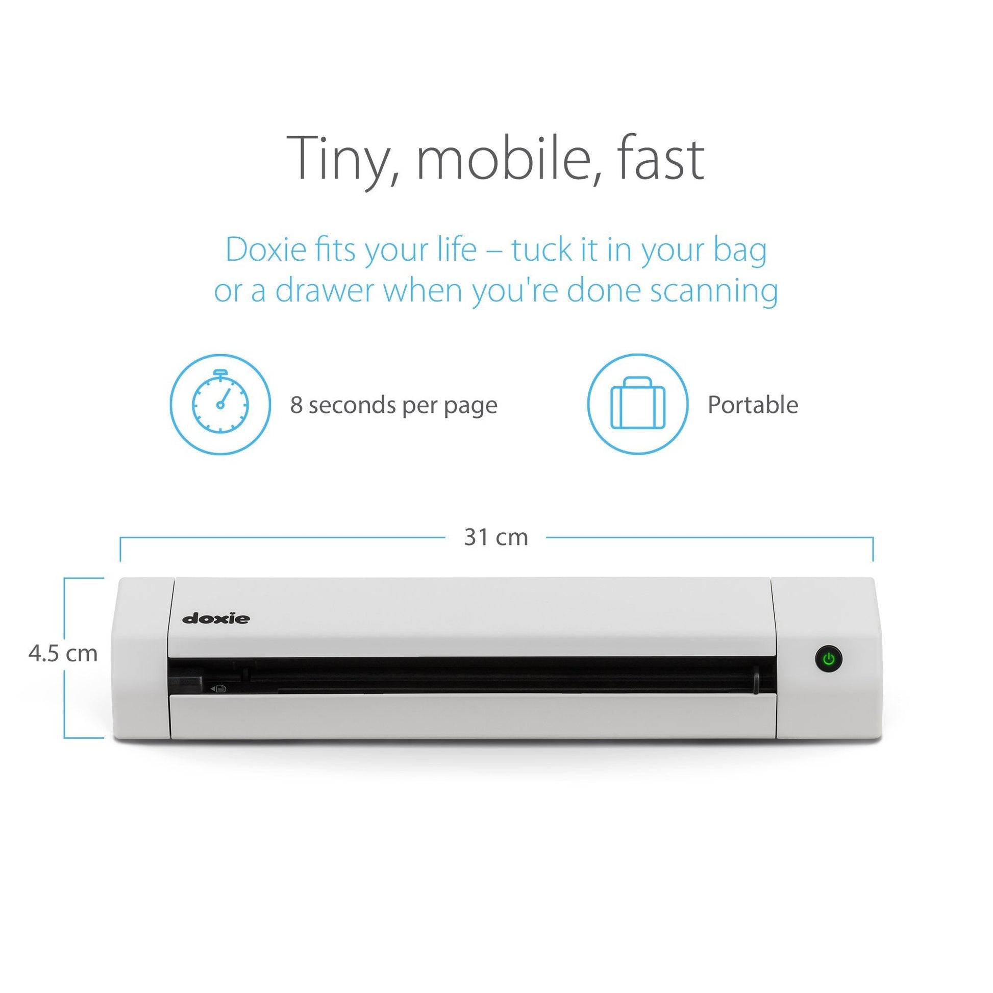 • 【Tiny + Battery Powered】Doxie is tiny – the size of a rolled up magazine – and portable with a rechargeable battery and included memory. Scan up to 400 pages per charge, store up to 8,000 pages before needing to sync.