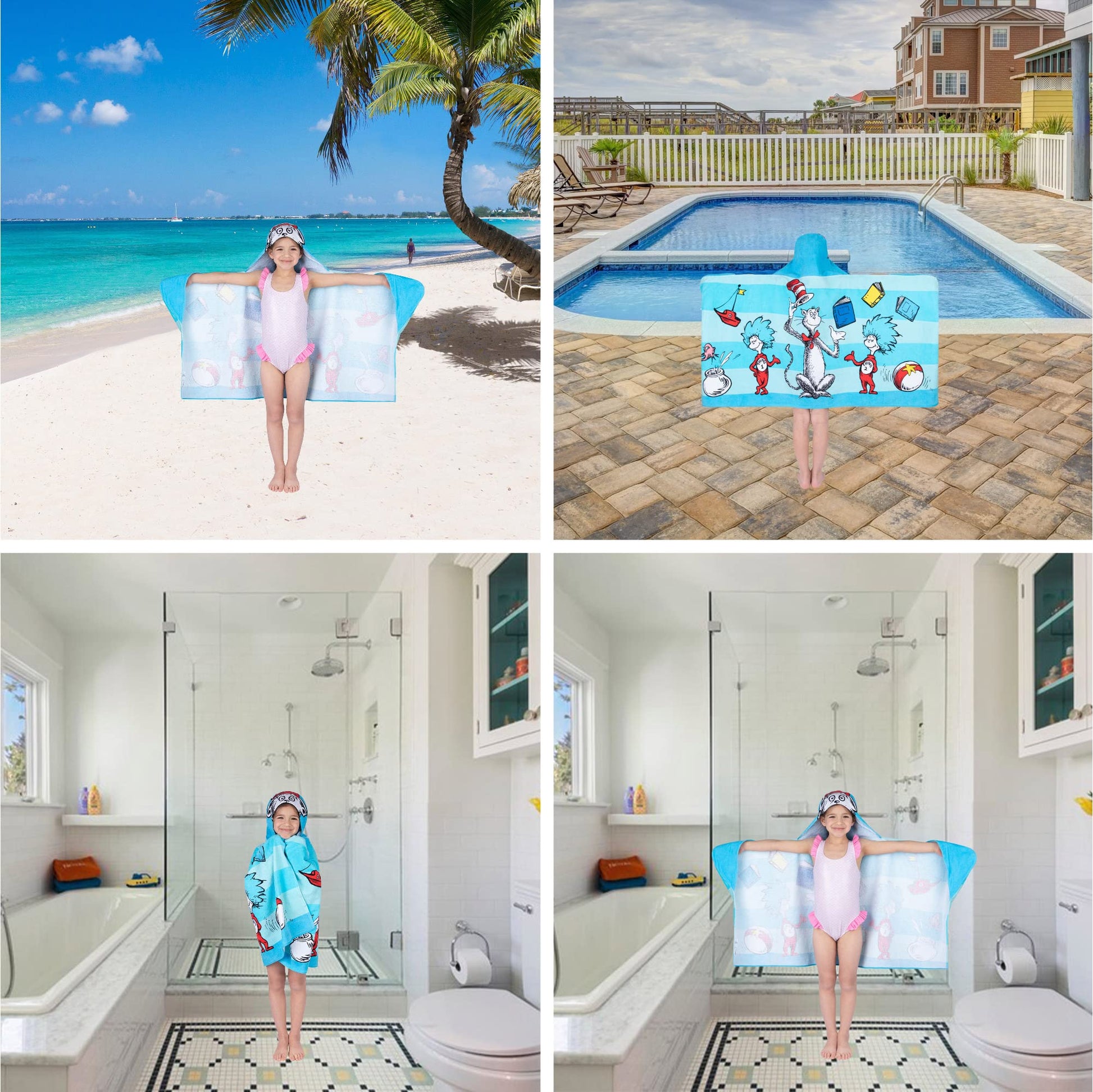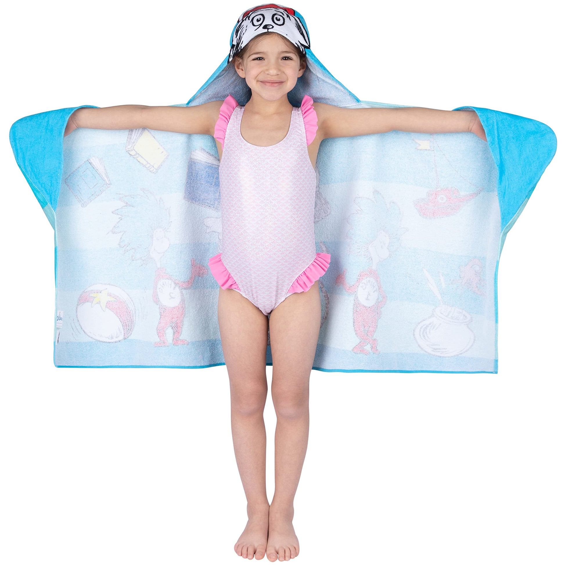 • DR SEUSS CAT IN THE HAT DESIGN: Bring the whimsical world of Dr. Seuss to your bathing and swimming routines with this playful hooded towel. Wrap your child up in comfort and colorful style with help from The Cat in the Hat and his companions Thing 1 and Thing 2 from the beloved children’s storybook.