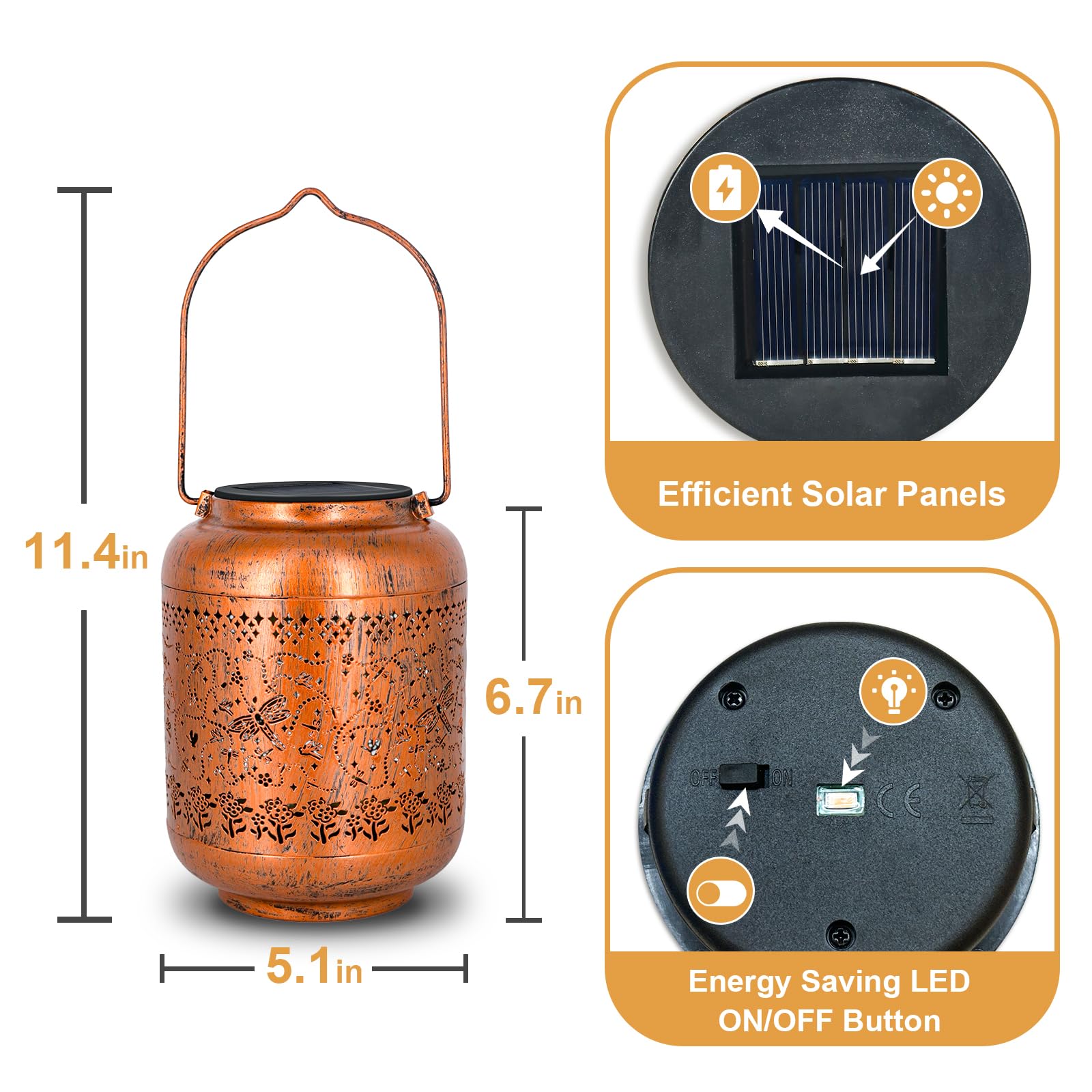 • 【Sturdy and waterproof solar lights】The outdoor lantern is made of metal, which is thickened and hardened, durable, and ensures that it will not deform. IP65 waterproof grade design, with excellent weather resistance, no need to worry about rain, snow, and other bad weather.