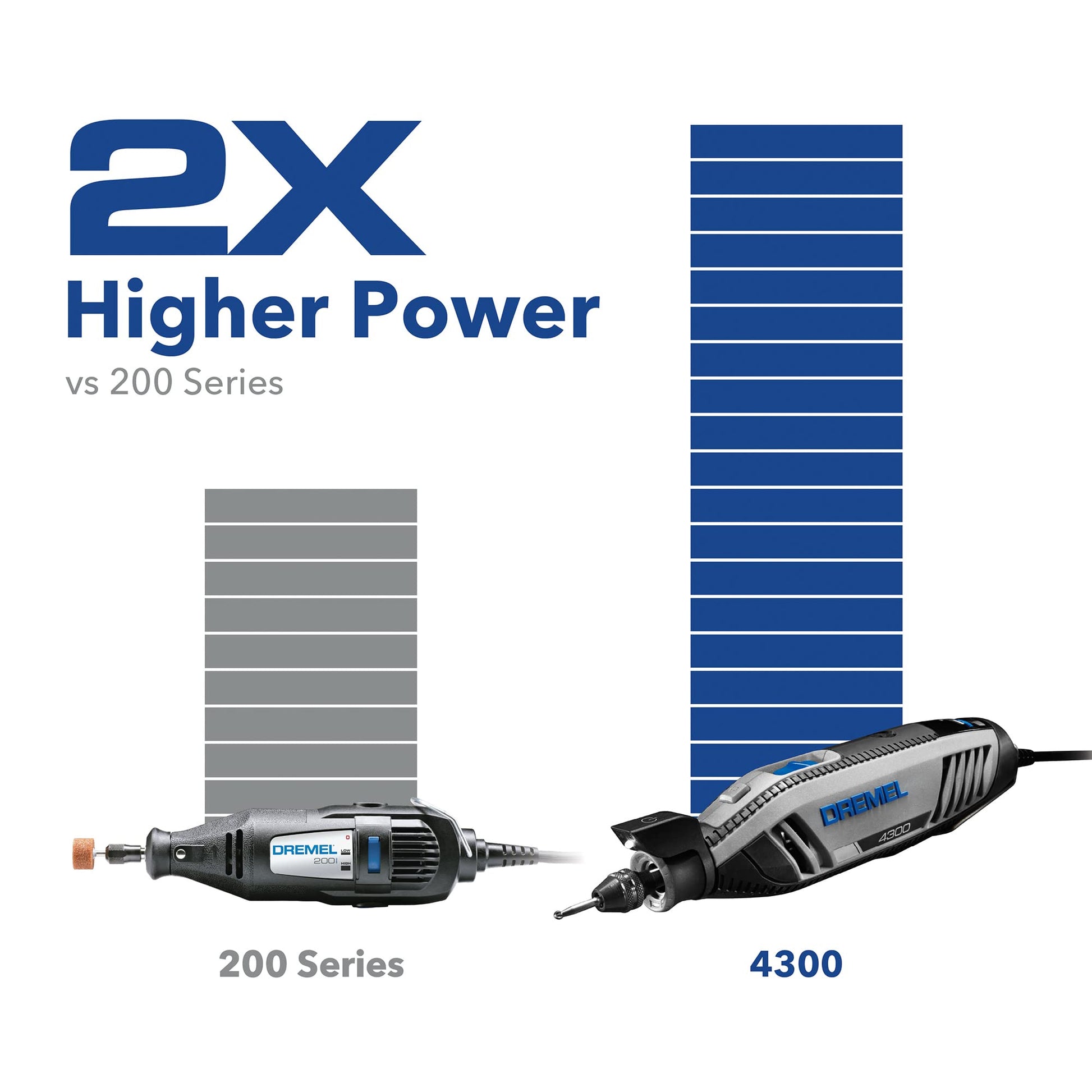 Details: Endless possibilities, one tool. From sanding to grinding, and routing to cutting; the Dremel 4300 produces power from job to job. The 4300 is the first Dremel rotary tool to allow tool-less and collet-less accessory changes with the inclusion of the keyless chuck. The chuck accepts all Dremel accessory shank sizes for fast and convenient accessory changes without ever using a wrench. Featuring the all new Pivot Light, your projects are well-lit with an optimum line of sight since the light pivots to direct illumination where you want it. Experiencing the full range of Dremel rotary tool applications is easier than ever because the 4300 offers our most powerful motor with built-in variable speed and electronic feedback circuitry. And the slim, ergonomic body design provides a comfortable 360-degree grip zone no matter how you hold it for extended ease of use. The completely redesigned airflow system lets the Dremel 4300 run cool, quiet, and smooth so completing projects are more enjoyable than ever. The Dremel 4300 is perfect for sharpening garden tools including lawn mower blades. This variable speed rotary tool is a wood engraver, metal engraver, glass engraver and etcher, detail sander, drill bit sander, and a micro drill