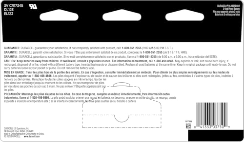 Details: The Duracell High Power Lithium CR123A 3 Volt batteries are designed to provide reliable power to specialty devices like home safety and security devices, high-intensity flashlights, home automation, and more. These CR123 batteries are guaranteed for 10 years in storage, so you can rest assured they are ready for your CR123 battery needs. From storm prep to holiday needs, Duracell is the # 1 trusted battery brand.