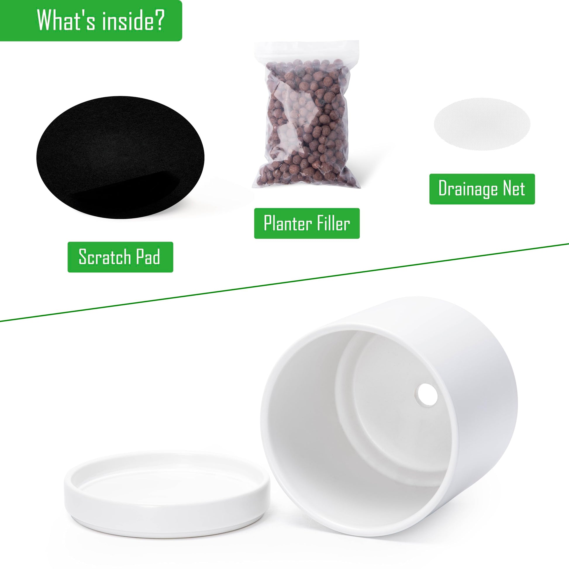 • Planter pot with drainage hole, mesh drainage net and protective scratch pad included.