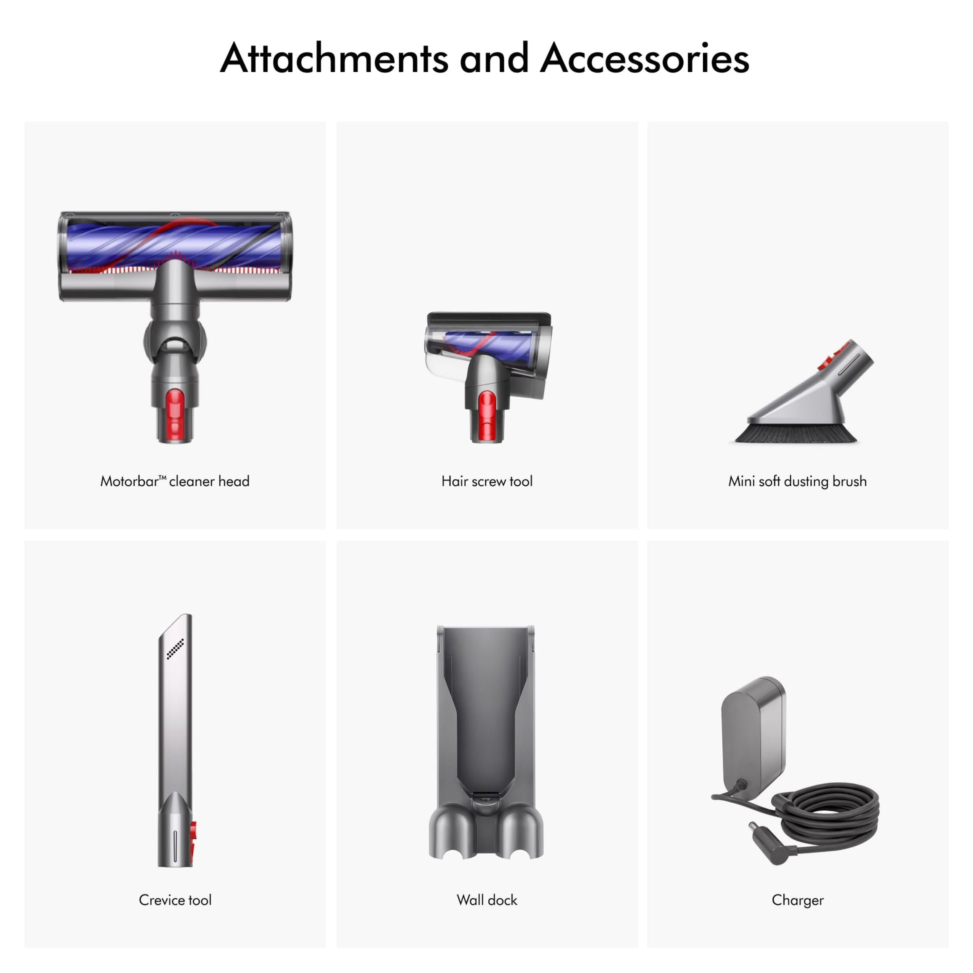 1 Motorbar cleaner head and 3 attachments to clean up high, down low, and everywhere in between. Plus wall dock and charger.