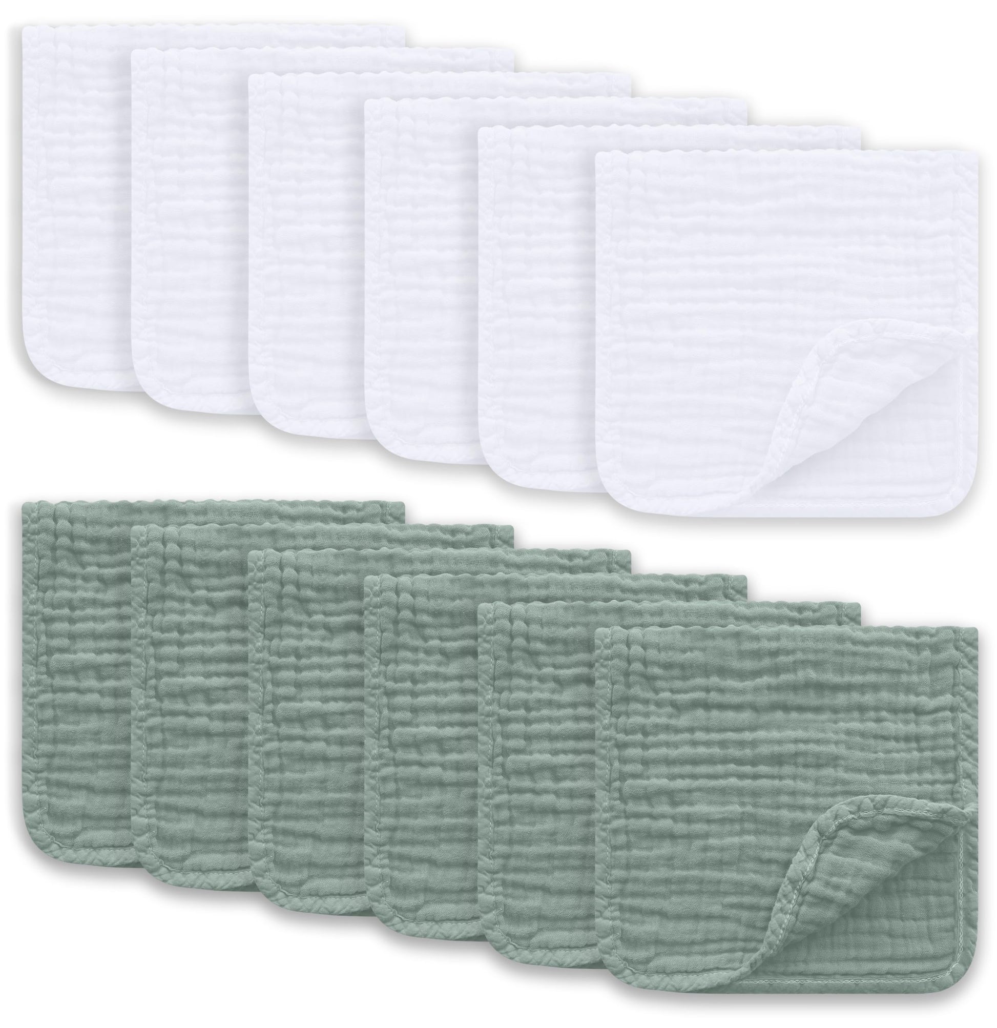 Ease Cubs Muslin Burp Cloths Large 100% Cotton Hand Washcloths for Boys & Girls, Baby Essentials Extra Absorbent and Soft Burping Rags for Newborn Registry (White & Green, 12-Pack, 20" X10")