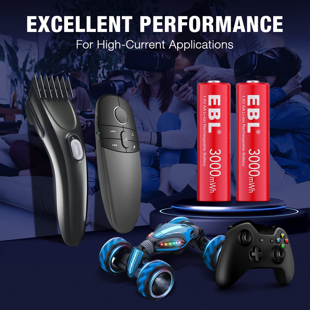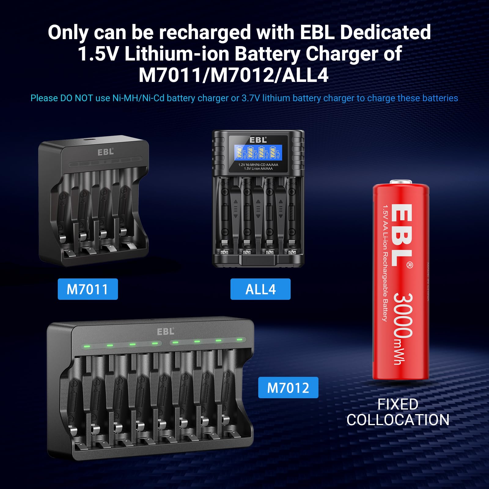 • 3000mWh High Capacity: EBL AA rechargeable batteries with advanced high density lithium cells, makes our batteries lasting longer than other batteries at same capacity. (Note:These 1.5v lithium batteries can only be charged by EBL 1.5V battery charger, and only compatible 1.5v devices)
