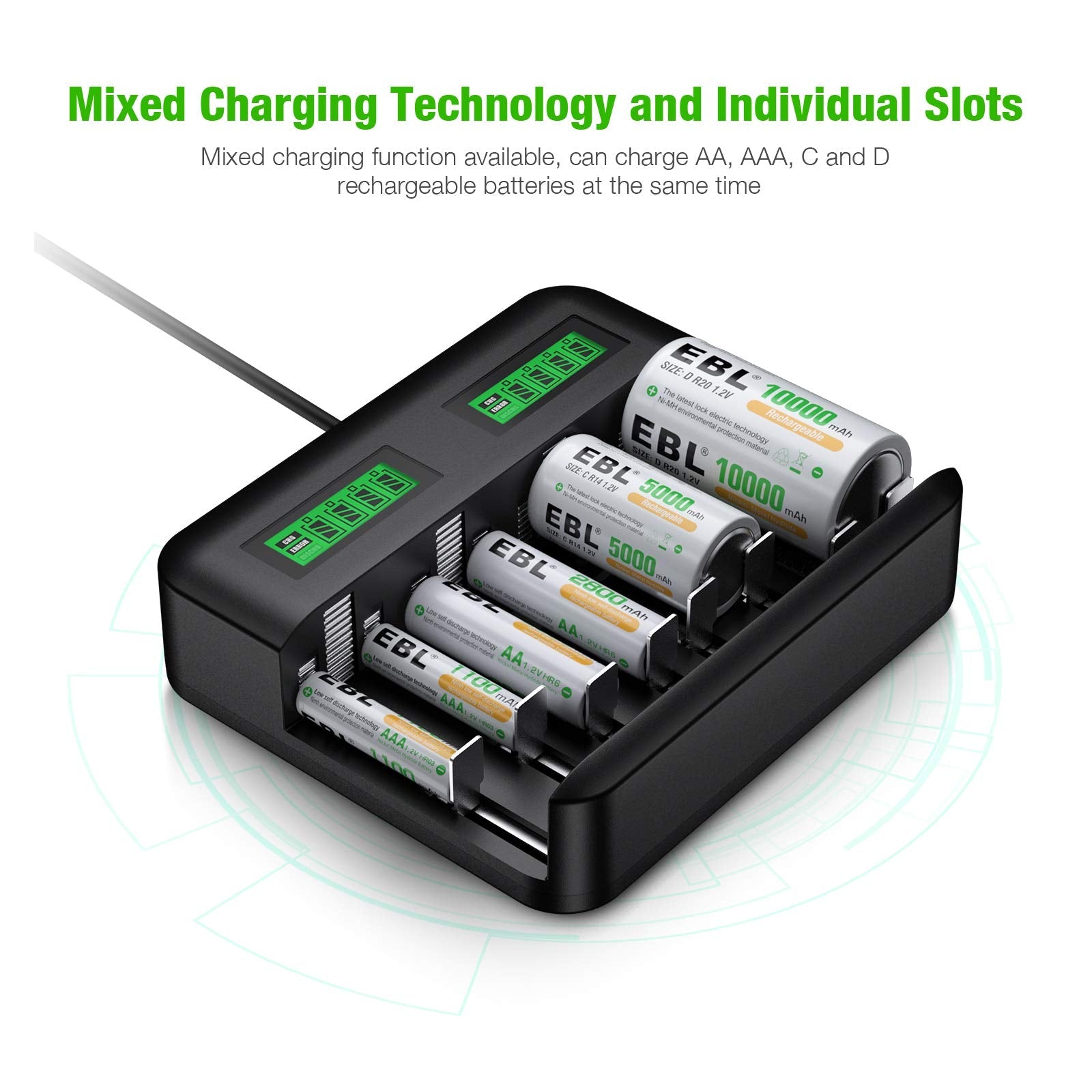 • Independent Battery Charger - EBL recchargeable LCD AA AAA C D battery charger, independent charging channels, 8 bays for 1/2/3...7/8 pieces AA/AAA Ni-Mh rechargeable batteries or 4 slots for 1/2/3/4 pieces C/D Ni-MH rechargeable batteries.(Attention: Not compatible for Lithiumn ion flat top batteries and non-rechargable batteries)