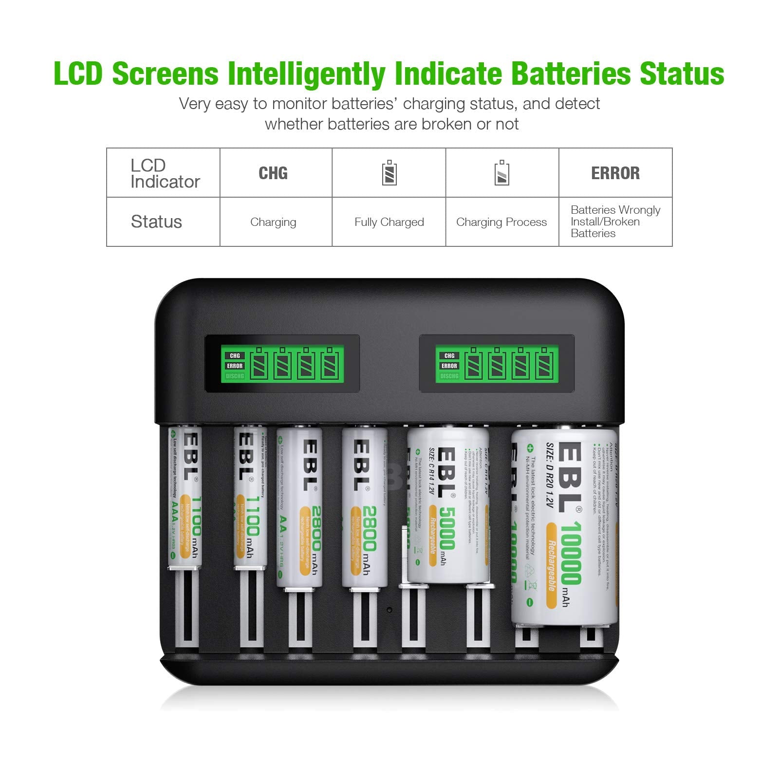 EBL LCD Rechargeable Battery Charger - 8 Bay AA AAA C D Battery Charger for Rechargeable Batteries Ni-MH AA AAA C D Batteries with 2A USB Port, Type C Input
