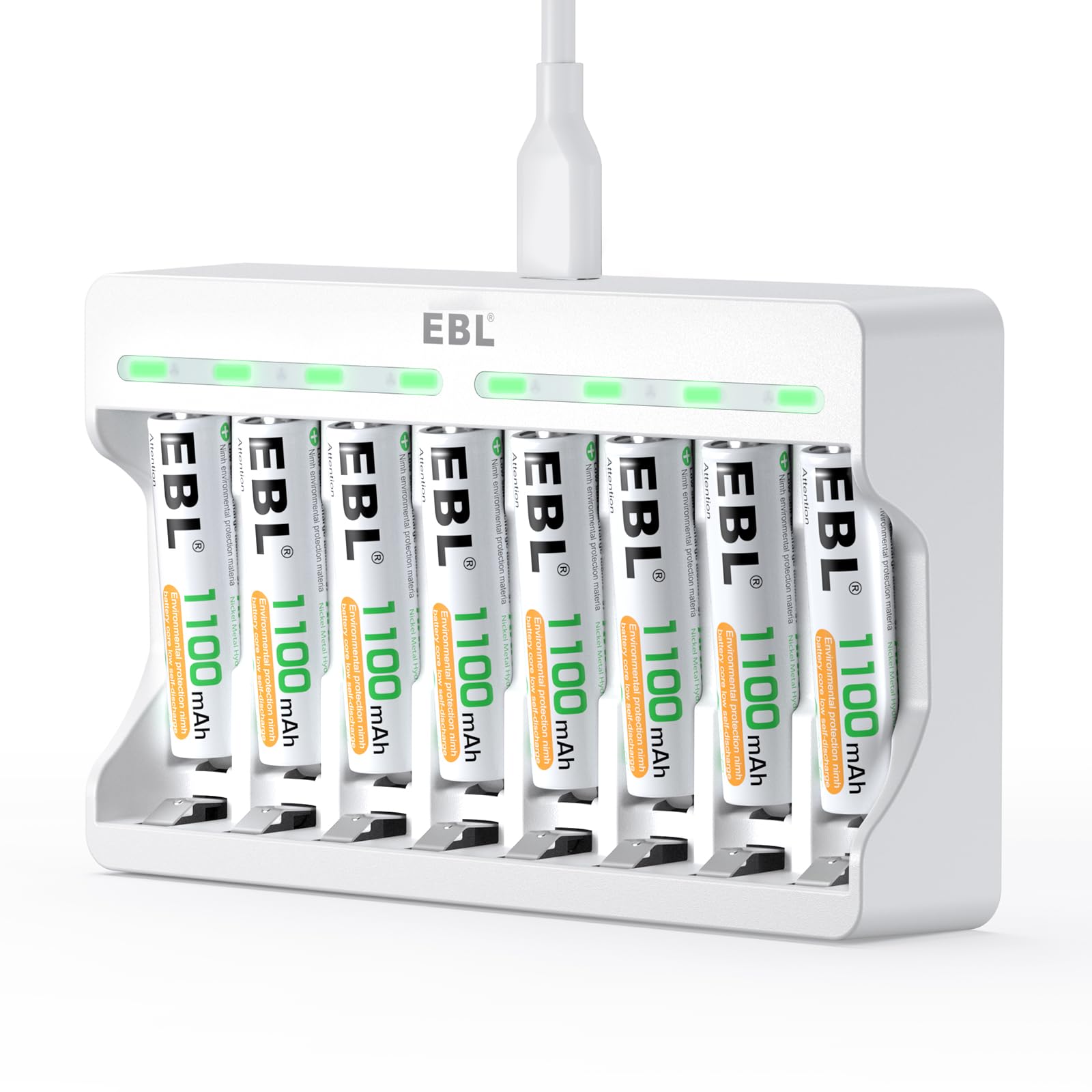 EBL Rechargeable AAA Batteries 1100mAh (8 Counts) and 8 Slot AA AAA Independent Rechargeable Battery Charger with 5V 2A USB Fast Charging Function