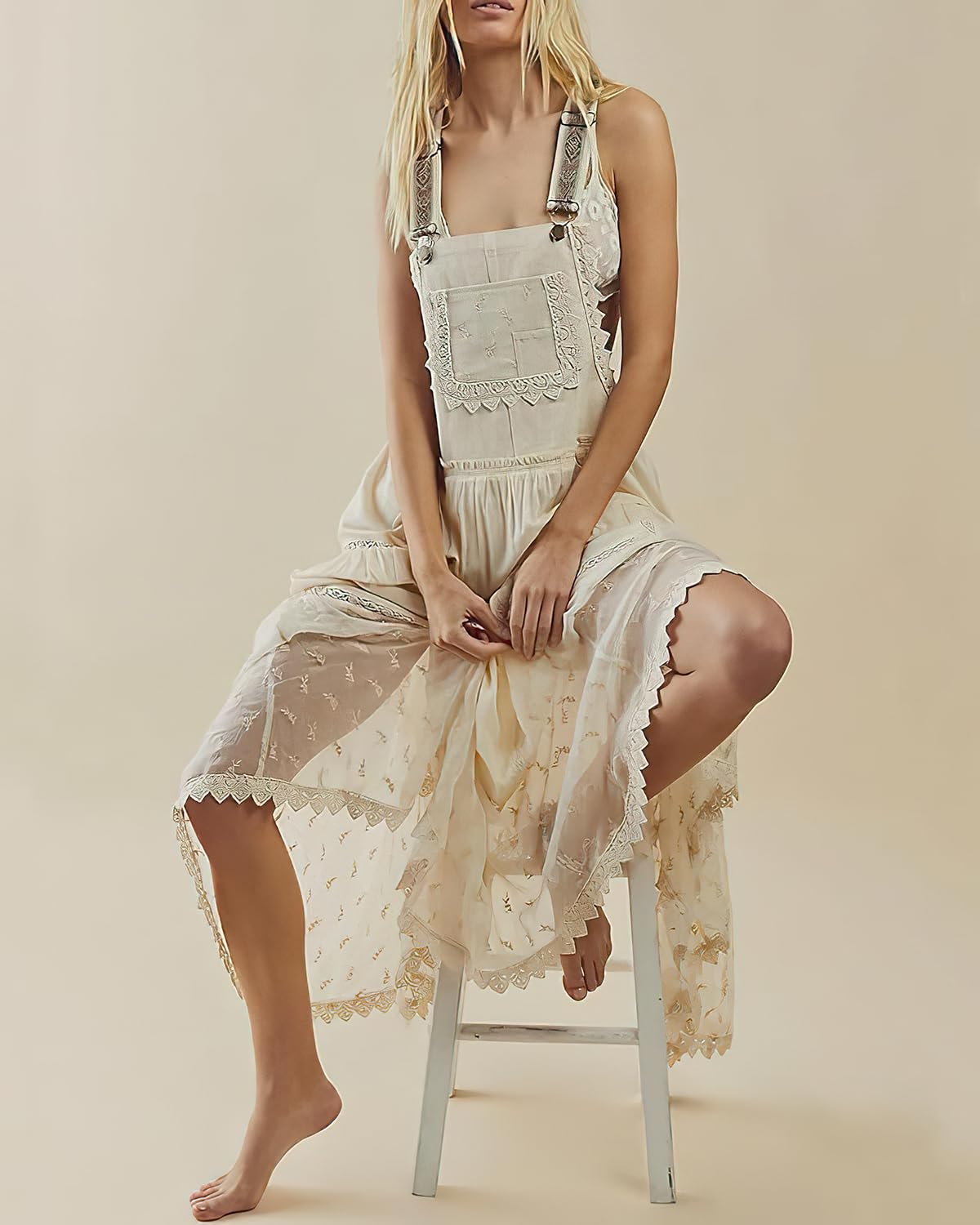 ebossy Women's Laced Embroidered Tulle Bib Dress Casual Loose Adjustable Straps Maxi Dress (M, Apricot)