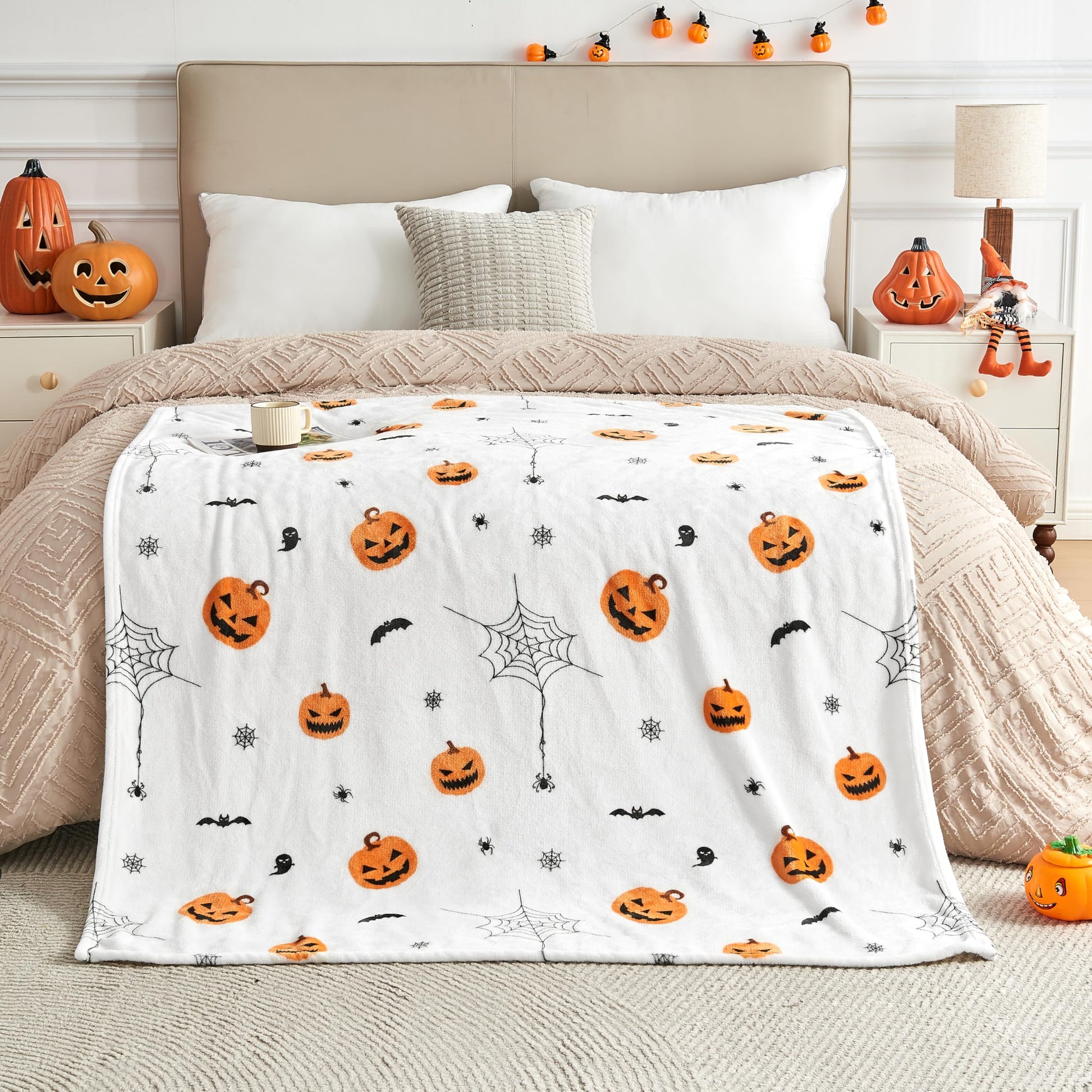 Edenleaf Soft Cozy Halloween Blanket, Spooky Pumpkin Bat Spider Webs Print White Throws for Couch Bed Home Decoration Gifts, Fuzzy Fleece Halloween Throw Blanket for Kids Adults 50"x60" (White)
