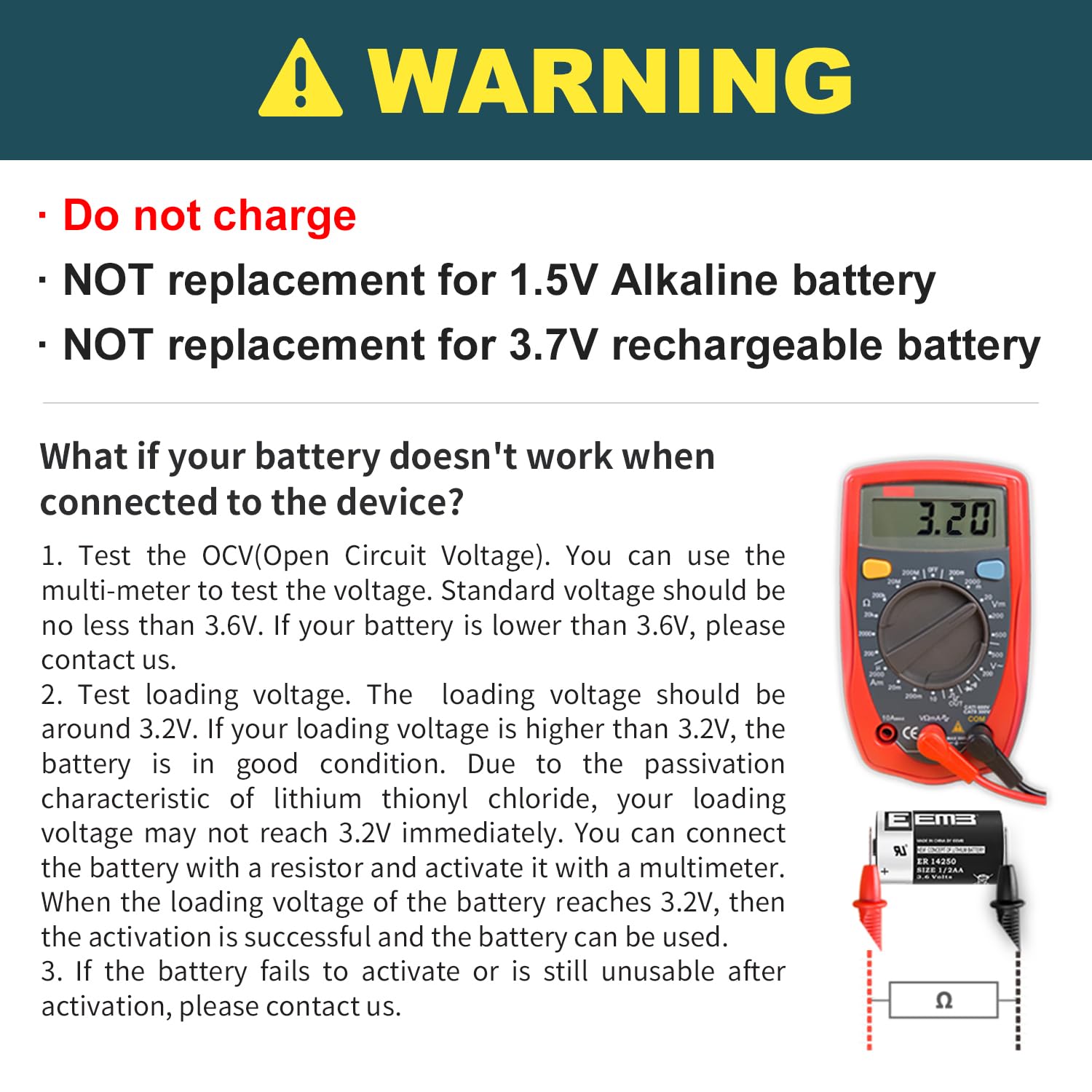 • BASIC INFO—3.6V non-rechargeable 1/2 AA size lithium thionyl chloride battery; 1200 mAh; 14.5*25mm/0.57*0.98 inch, wide range of temperatures -55°C to +85°C; most suitable for low power consumption devices. please check carefully if the ER14250 battery is the size you need for your electronic device before purchasing.