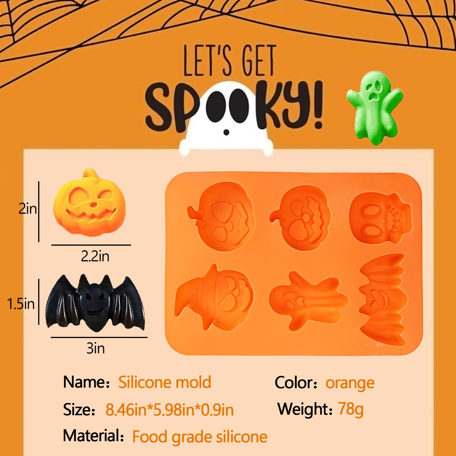 • What You Get: A 6 cavities Halooween silicone mold, made from 100% food-grade silicone. Flexible surface and non-toxic, enable you to clean and remove whitout trouble. Size is around 8.5*6*0.9 in.