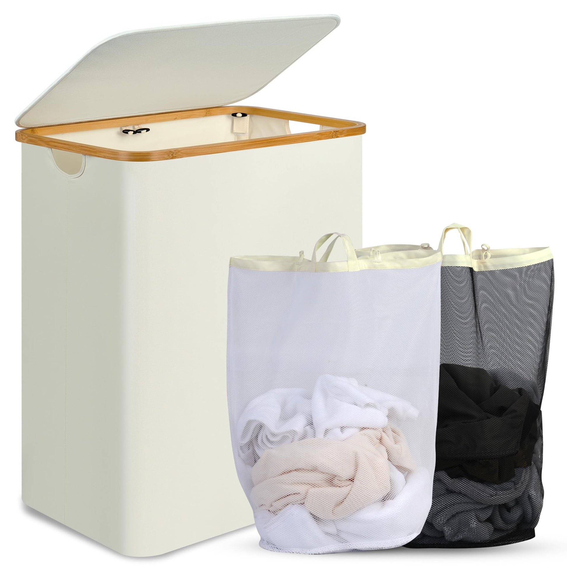efluky Laundry Hamper with Lid, 160L Tall Laundry Basket with Bamboo Handles for Clothes and Toys, Collapsible Laundry Hamper with 2 Inner Bags for Bedroom and Bathroom, Beige
