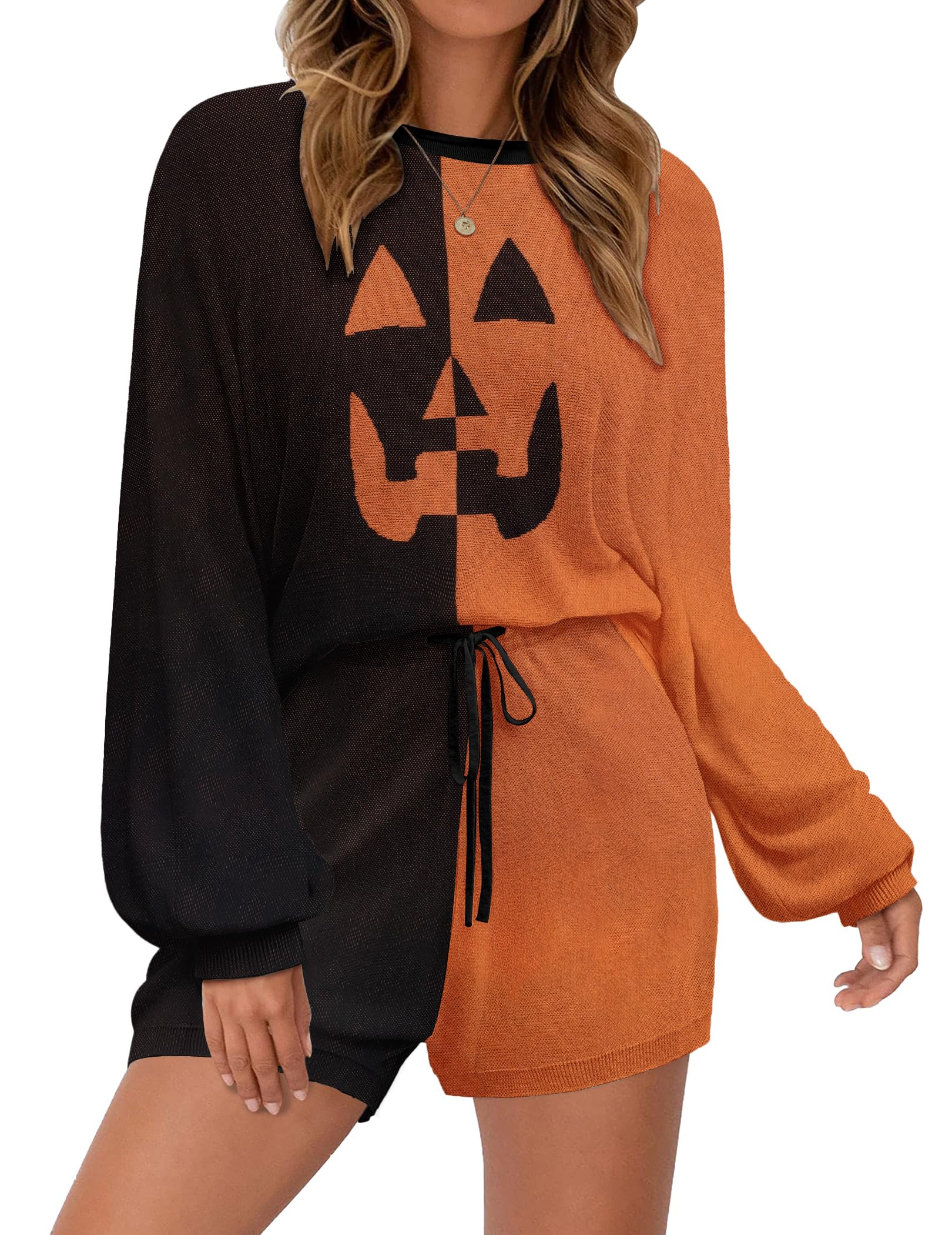 Ekouaer Knit Pajamas Set for Women Lounge Sets 2 Piece Long Sleeve Top and Shorts Pj Soft Sleepwear Cute Sweater Outfits Halloween Orange S