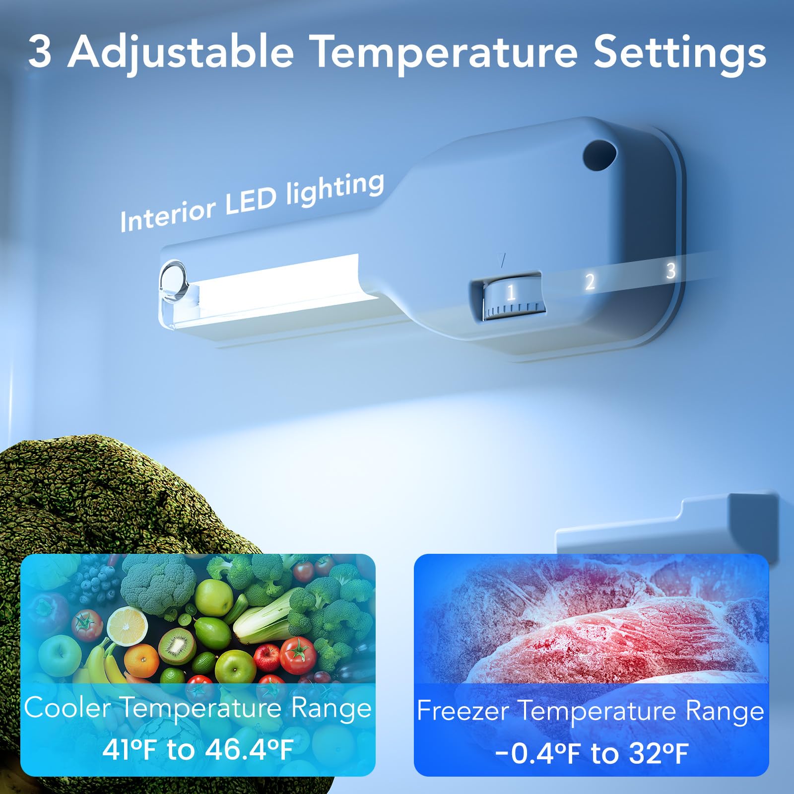 • The small refrigerator with thermostatic knob can be adjusted to 32°F to 50°F in the refrigerator compartment / 3°F to -1°F in the freezer compartment. Turn the thermostatic knob, meet the different temperature requirements of different foods.