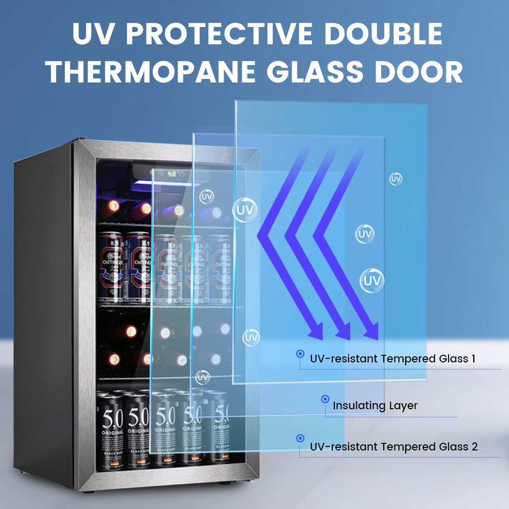 • Excellent Cooling: Our beverage refrigerator with glass door is equipped with a high-performance compressor that provides constant and even cooling. The glass door ensures airtight sealing to keep cold air inside and maintain your drinks at the ideal temperature at all times.