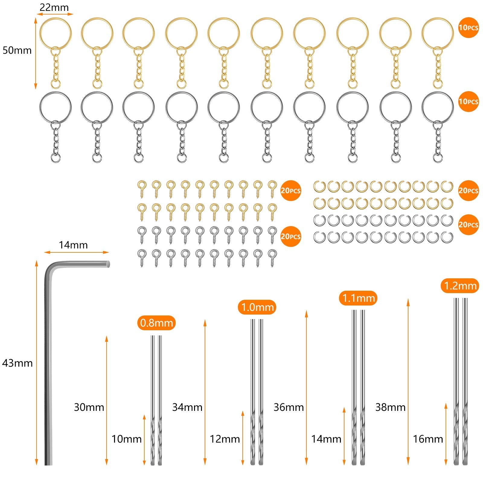 • You will get: the package comes with 1 piece electric hand drill with 8 pieces drill bits (0.8-1.2 mm), including 2 pieces 0.8 mm, 2 pieces 1.0 mm, 2 pieces 1.1 mm, 2 pieces 1.2 mm, 20 x key rings (gold and silver), 40 x screw eye pins (gold and silver), 40 pieces 7 mm open rings (gold and silver), 1 piece wrench, 110 pieces in total