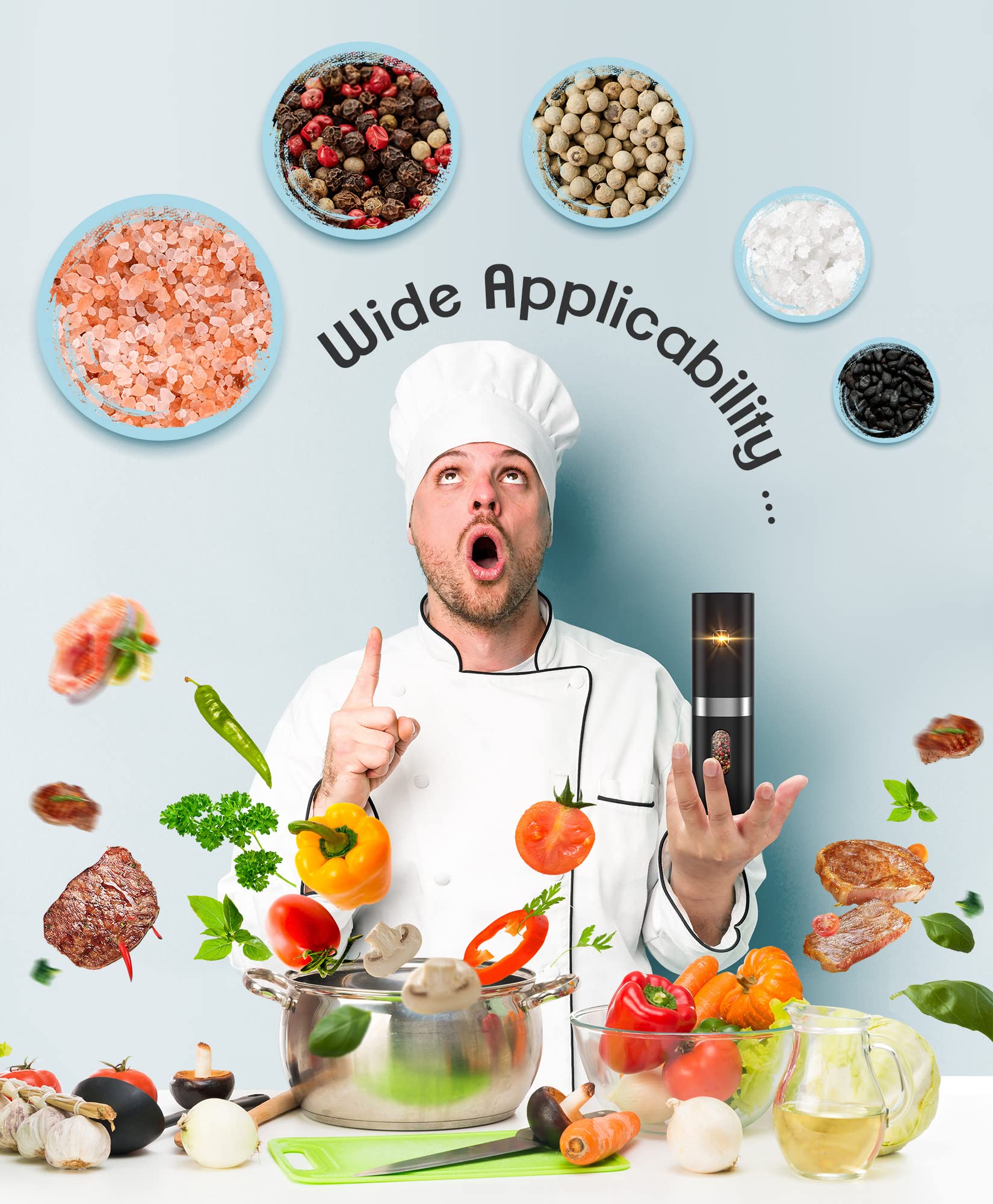 • Wide Applicability And You Can Get A Wide Variety Of Spices: Our rechargeable salt and pepper grinder set is suitable for black pepper, white pepper, salt, and other solid-grain seasonings, making it ideal for any meal; Just press the button and you will get freshly ground salt or pepper right away ⚠️Note: If the salt is moist, please try to dry the salt a little before grinding to get the best results