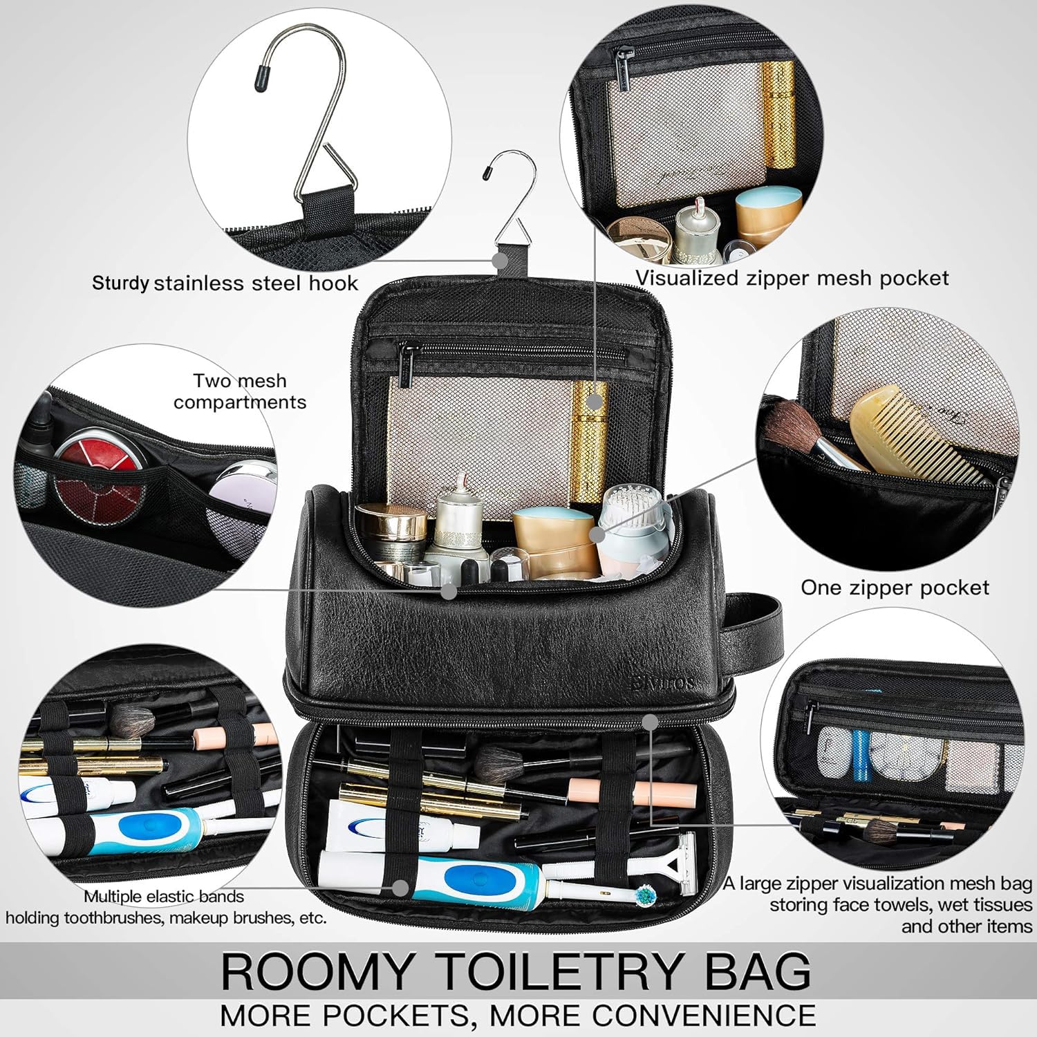 Elviros Toiletry Bag for Mens PU Leather Travel Organizer Kit with Hanging hook, Large Water-resistant Toiletries Bathroom Shaving Bags (Black)