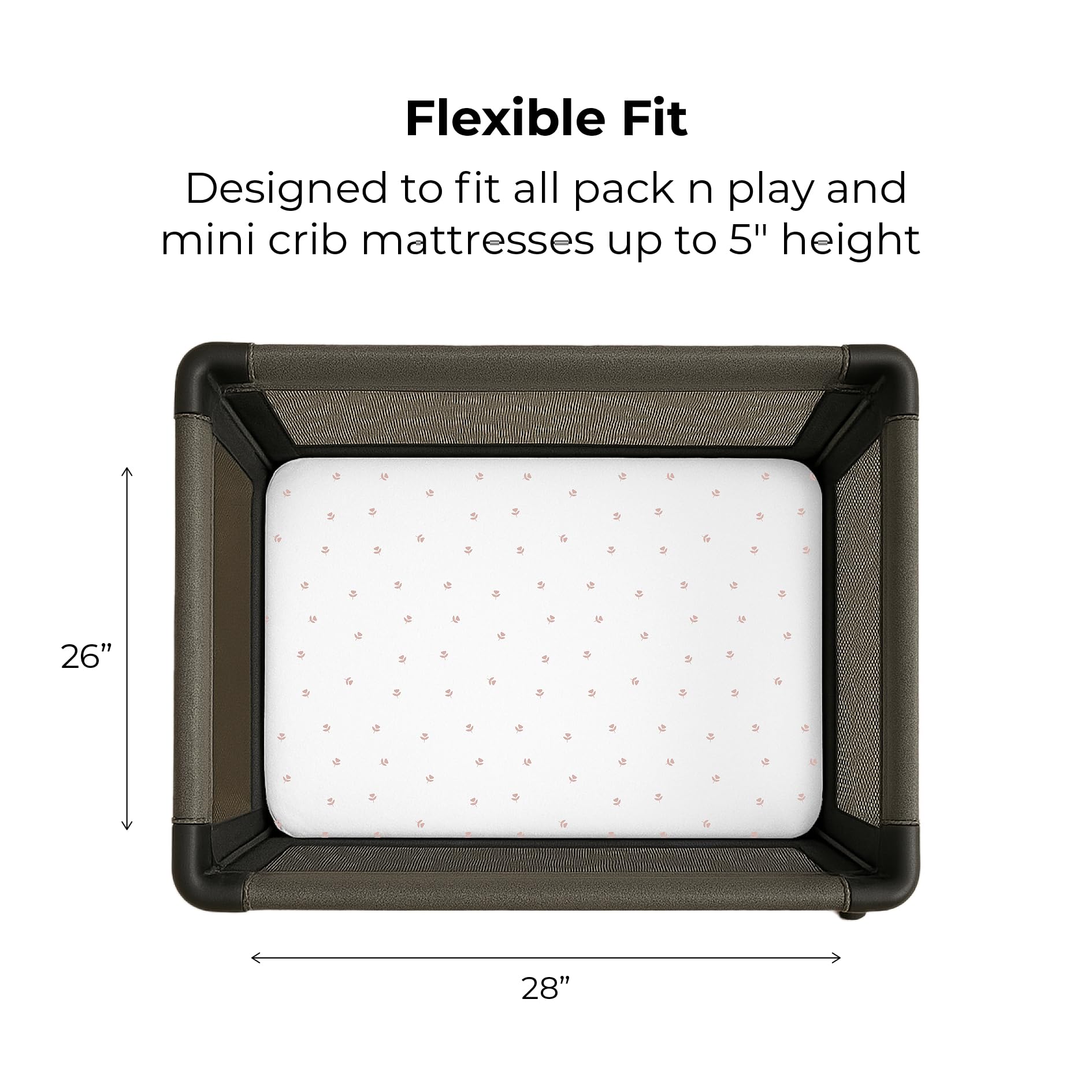 • Flexible Fit for Standard Pack n Play and Mini Crib Mattresses: Our sheets, sized at 38”x24”x5”, feature an innovative elastic band for adaptable stretch and a secure fit. Designed for standard Pack and Play mats (39”x27”x0.5”), portable, and mini crib mattresses (38”x24”x3”), the elastic ensures the sheet stays snugly in place on mattresses up to 5 inches thick. Compatible with Graco Pack n Play and other standard playards and playpens, it provides a smooth, safe surface for your baby.