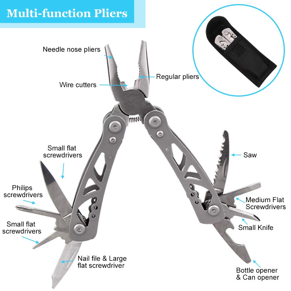 • [Multi-funcion Tool]: The steel tool card is a multi-tool, including can opener, screwdriver, ruler, cap opener, 4 position wrench, butterfly wrench, saw blade, direction ancillary indication, 2 position wrench, and a key ring holder. The flashlight has High / Low / Strobe Light Modes.(The battery of flashlight is not included.)