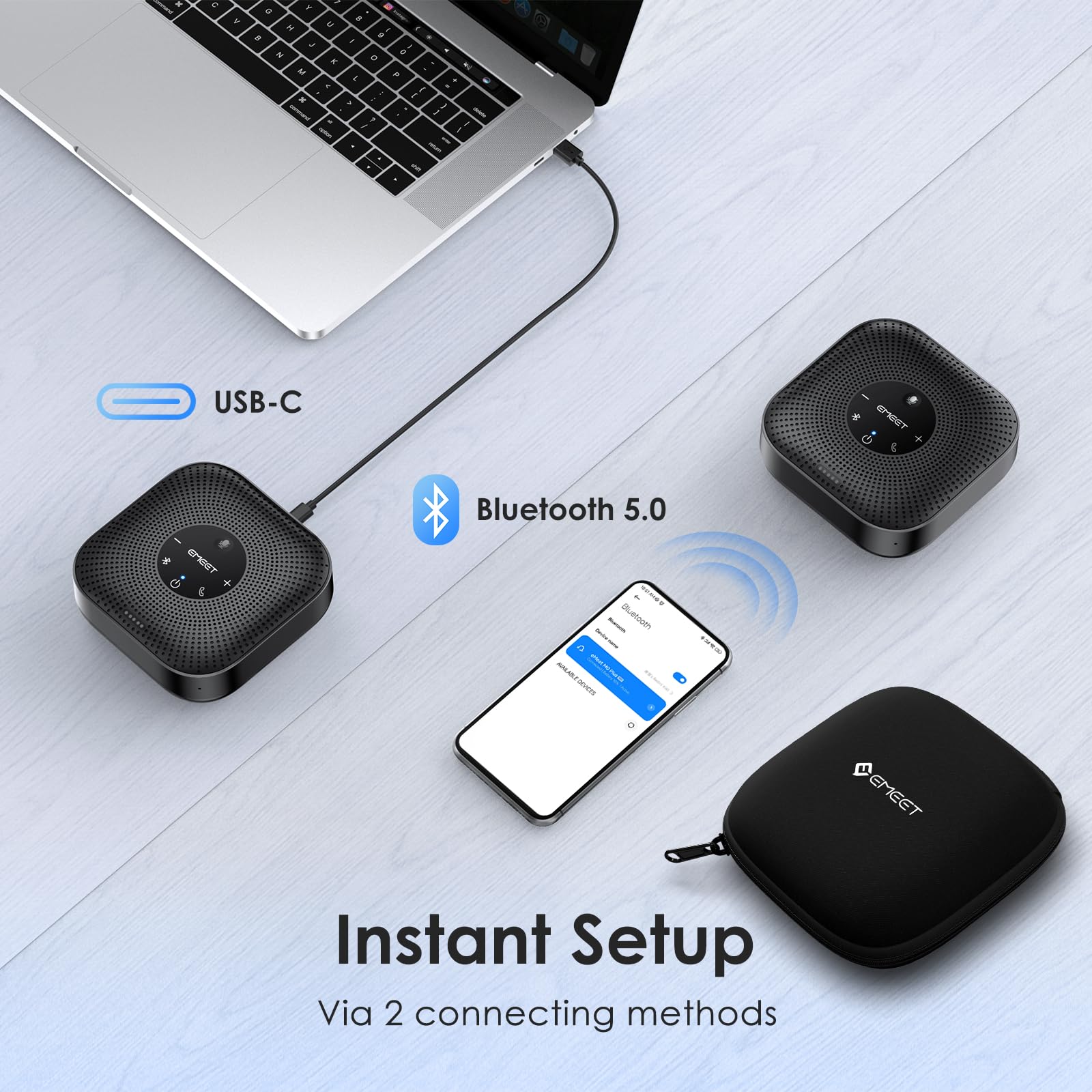 • Easy to Set Up and Use - The EMEET Conference Speaker and Microphone M0 Plus offers 2 ways to connect: USB-C and Bluetooth 5.0. No drivers or additional software is required, simply plug and play. The speakphone is compatible with most conferencing platforms, such as Zoom, Microsoft Teams, Skype, Slack, Webex, and etc. Mobile phones applied with commonly used Bluetooth Protocol on the market can be connected to M0 PLUS through Bluetooth, and there are no restrictions on brand and model.