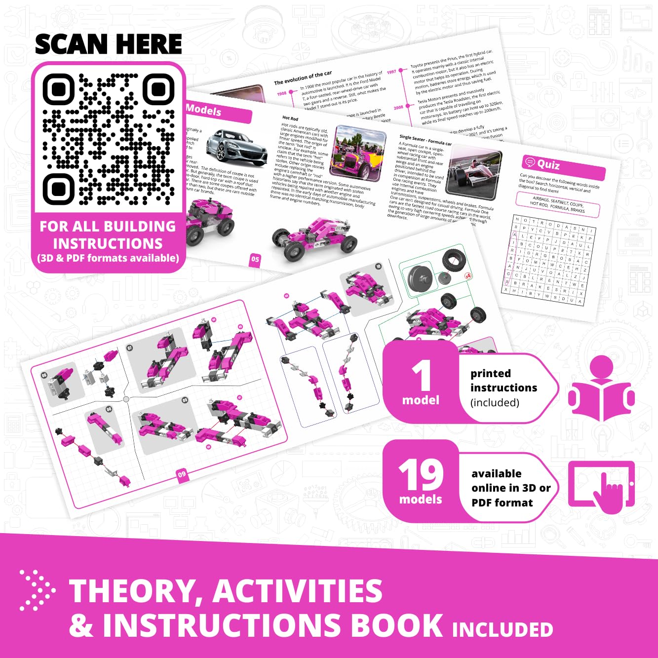 Details: Examine facts about Supercharged Speedsters and Car Safety through STEM (science, technology, engineering, and math) building challenges and exercises, a short quiz, and experiments. Through a diverse theme-based engineering toy, we want to inspire girls to take their first steps in STEM and develop critical skills such as learning how to think and build in 3D space while finding creative solutions to real-world engineering problems. This kit provides 2 printed and 18 online instructions to build 20 engineering toy models including a buggy, snowmobile, helicopter, sports car, and many more. All the pieces can easily be stored and kept safe in their plastic tub. Handle color may vary. Children will get to practice STEM in real life and VR with an interactive 3D application for freestyle creative play. Note results and conclude experiments to compare and contrast between trials for an awesome STEM experience. Compatible with other Engino toys. Made with toxin-free plastic to ensure safety and hours of learning and fun for your child. Recommended for ages 7 and up.