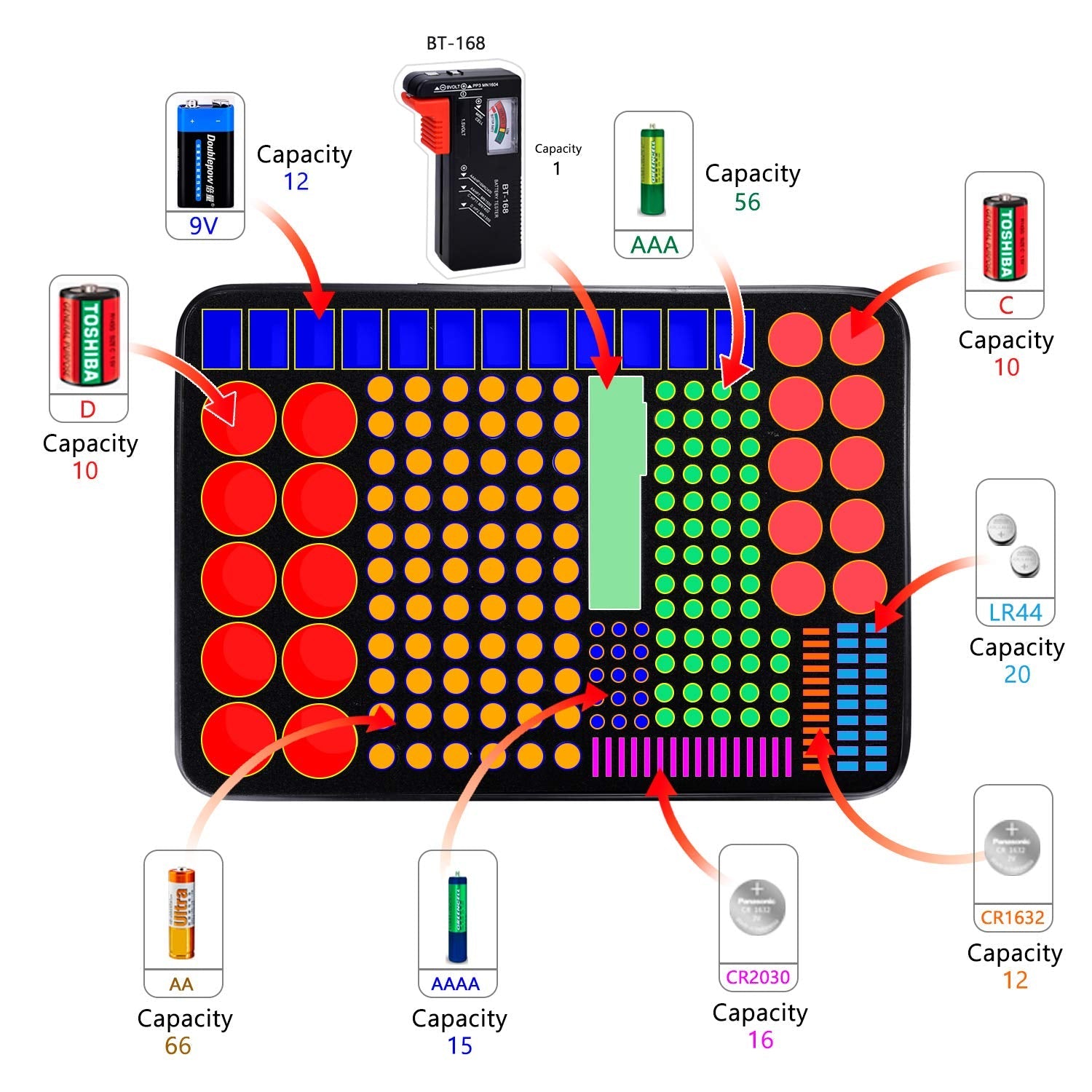 • For more type batteries: 13.4*9.5*3 inches size. It can hold 66*AA, 56*AAA, 10*C, 10*D, 12*9V,15*AAAA, 48*Button type batteries( 3V lithium - CR 2032,CR 2016,CR 1632, CR 2025,LR44. Duracell - 1616/ 2025/ 2032/ 2016), total over 220 batteries. Fireproof battery organizer bag also comes with two zippered pockets for easy storage of Battery Tester and other types of batteries(CR2,CR123A,23A), perfect for Energizer Alkaline Batteries, ACDelco, Panasonic, Duracell batteries.