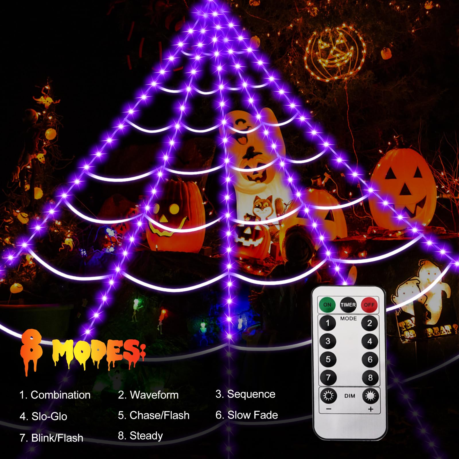 • Giant Light-Up Spider Web with Spider:This is a 16.4Ft giant spider web.The unique design and twinkling lights will definitely make you stand out in your Halloween carnival night.Packaging also includes:1pcs giant glowing spider,20g spider silk,20pcs small spiders,1 hook and 5 ground stakes.2 power supply modes: USB and plug,flexible selection according to your needs.