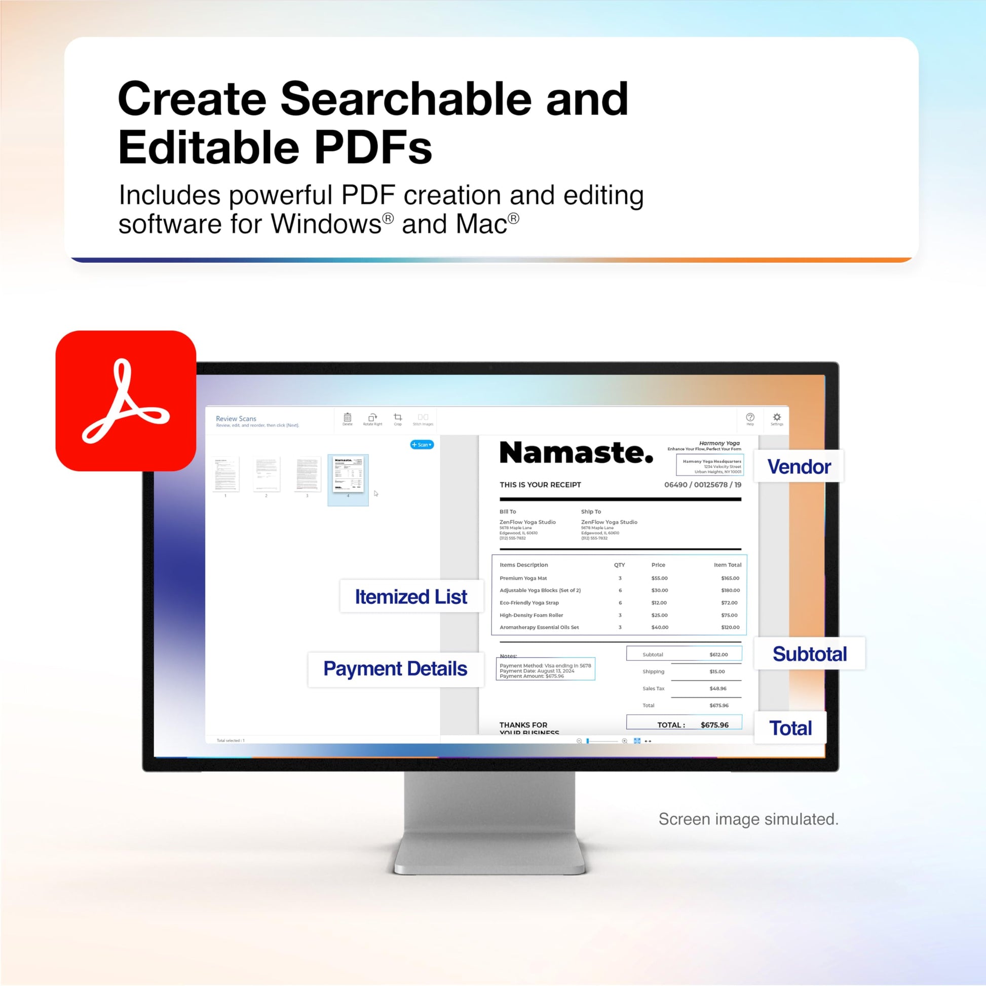 • Create Searchable and Editable PDFs — Includes powerful PDF creation and editing software for Windows and Mac