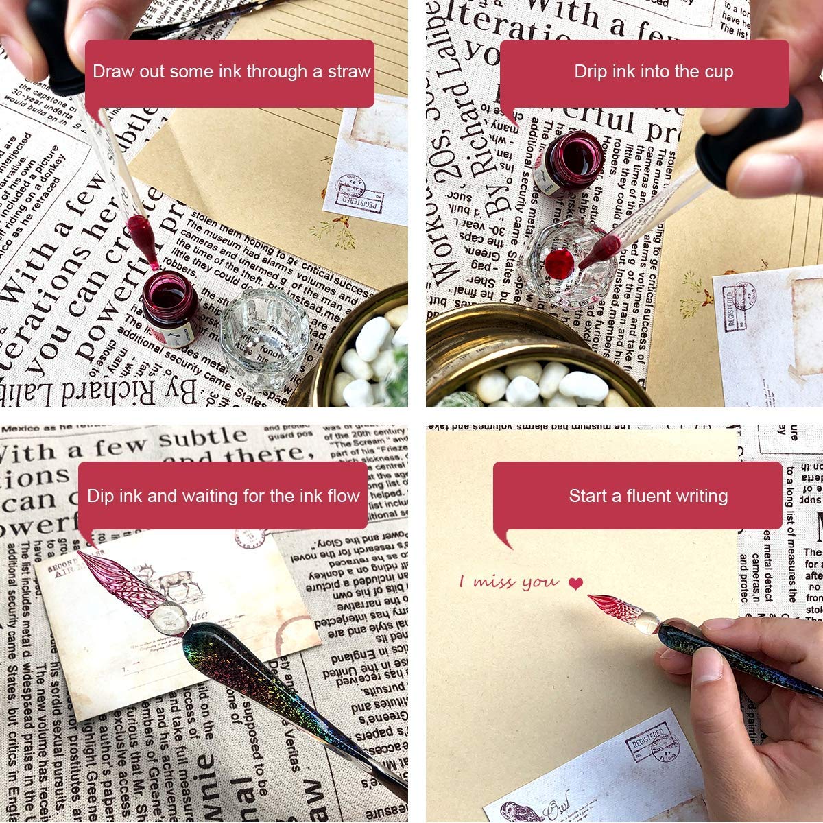 • Artistic and Versatile: This signature pen is great for drawing and writing. Made of high borosilicate glass. Four bottles 15 ml colors of ink contain gold powder, which enables your handwriting and painting to become more awesome