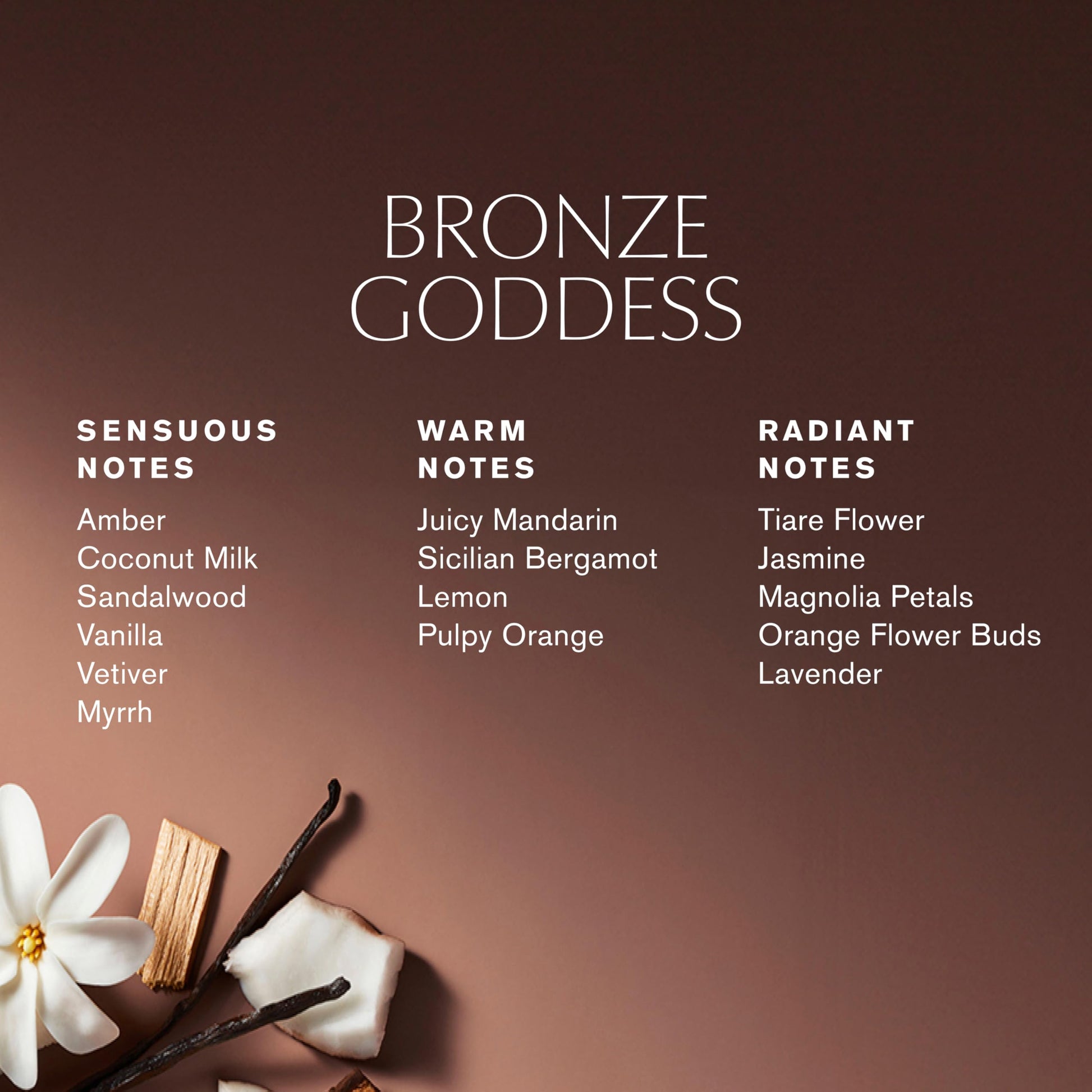 • BASE NOTES: Tiare Flower, Jasmine, Magnolia Petals, Orange Flower Buds, Lavender