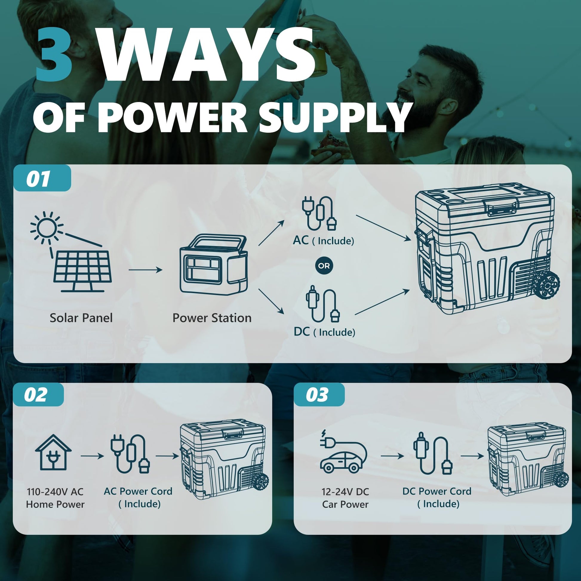 • Battery Protection & Multiple Power Supplies; This portable electric cooler offers 3-level battery protection, allowing you to adjust the input power between L/M/H modes to prevent overload or vehicle battery drain. The portable fridge can be powered by both DC and AC, making it suitable for various scenarios
