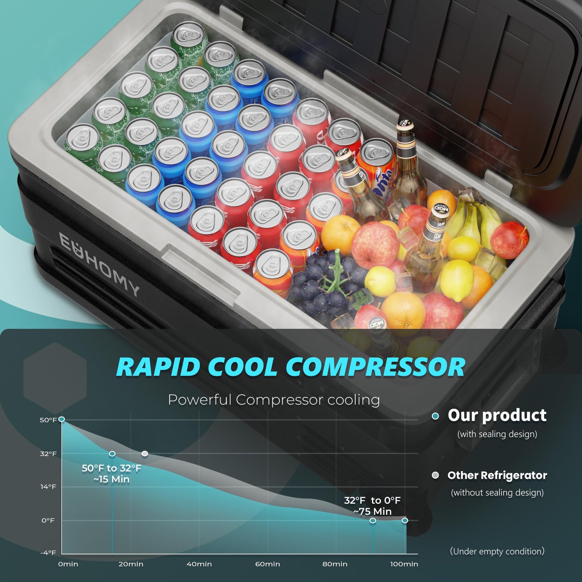 • Powerful Compressor & Excellent Insulation; The portable freezer is equipped with a high-efficiency variable frequency compressor, offering powerful cooling and a temperature range from 0°F to 68°F. UL energy-certified, the 12 volt cooler features both ECO and MAX cooling modes, consuming only 45W. The 40mm thick insulated, durable exterior ensures optimal temperature maintenance