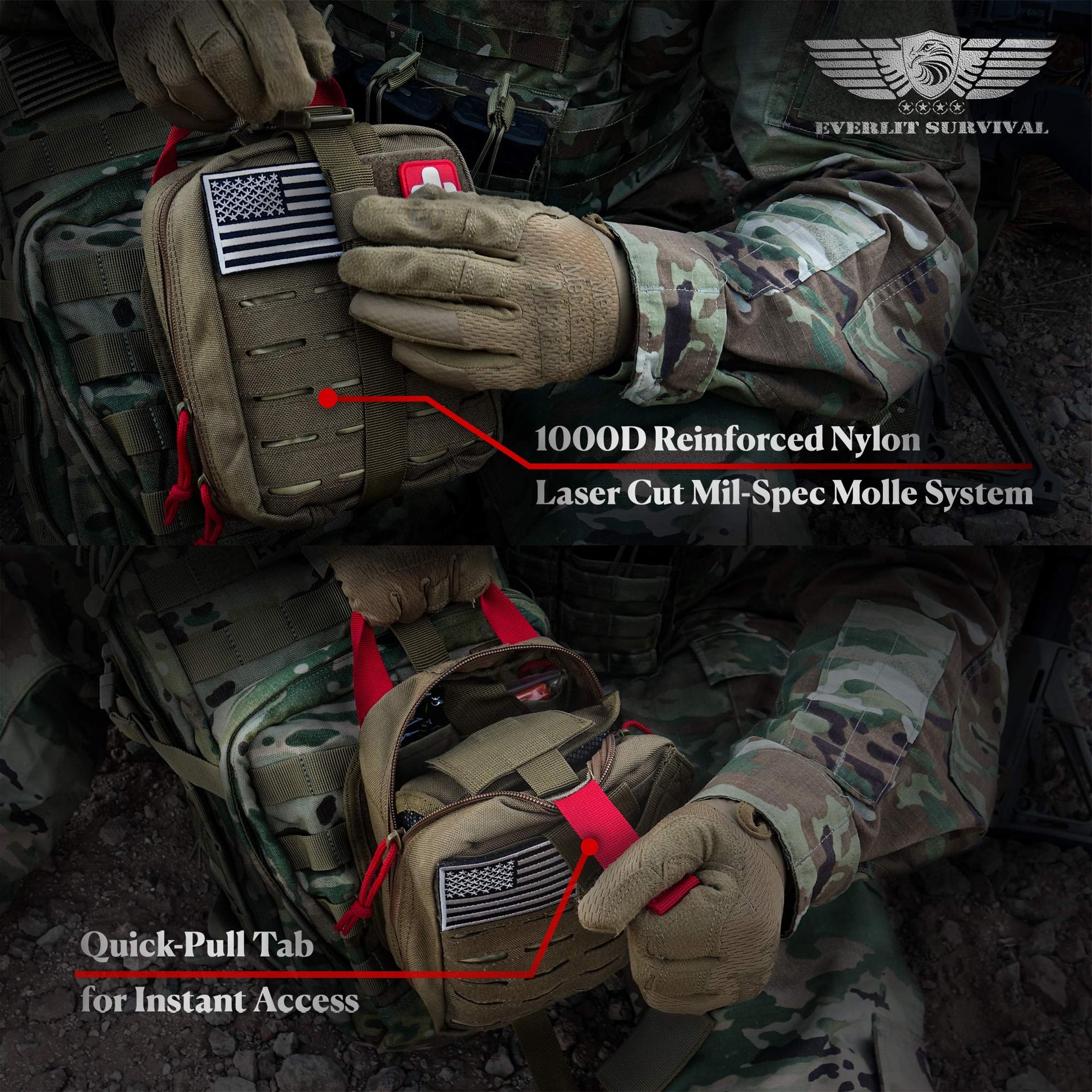 EVERLIT Advanced Emergency Trauma Kit, CAT GEN-7 Tourniquet Mil-Spec Nylon Laser Cut Pouch with 36" Splint, Military Combat Tactical IFAK for First Aid Response Bleeding Control (Coyote Brown)