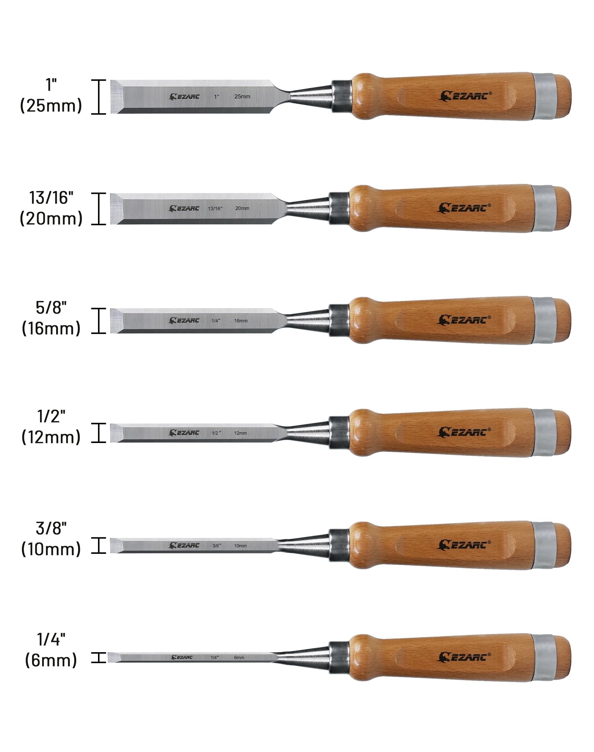 • EZARC premium set of wood chisel includes a variety of sizes, 1/4”(6mm), 3/8”(10mm), 1/2”(12mm), 5/8”(16mm), 13/16”(20mm), and 1”( 25mm), to cater to all your woodworking needs. Whether you're a seasoned woodworker or just starting out, this set is sure to impress.