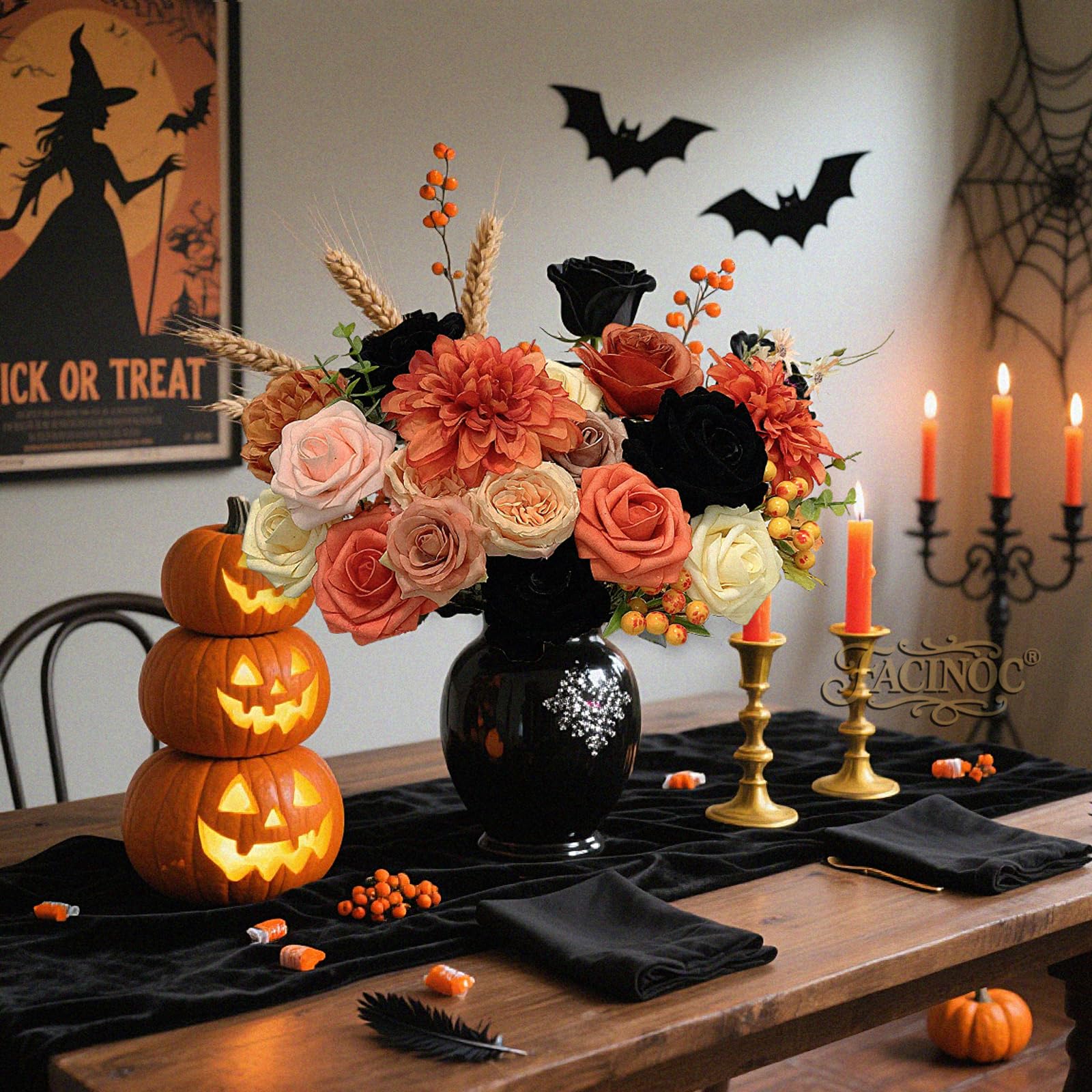 FACINOC Roses Artificial Flowers Fall Orange Black Bouquet Box Set for DIY Halloween Wreath Autumn Wedding Bridal Shower Decorations Party Table Centerpieces Fake Floral Arrangement Home Decor Indoor