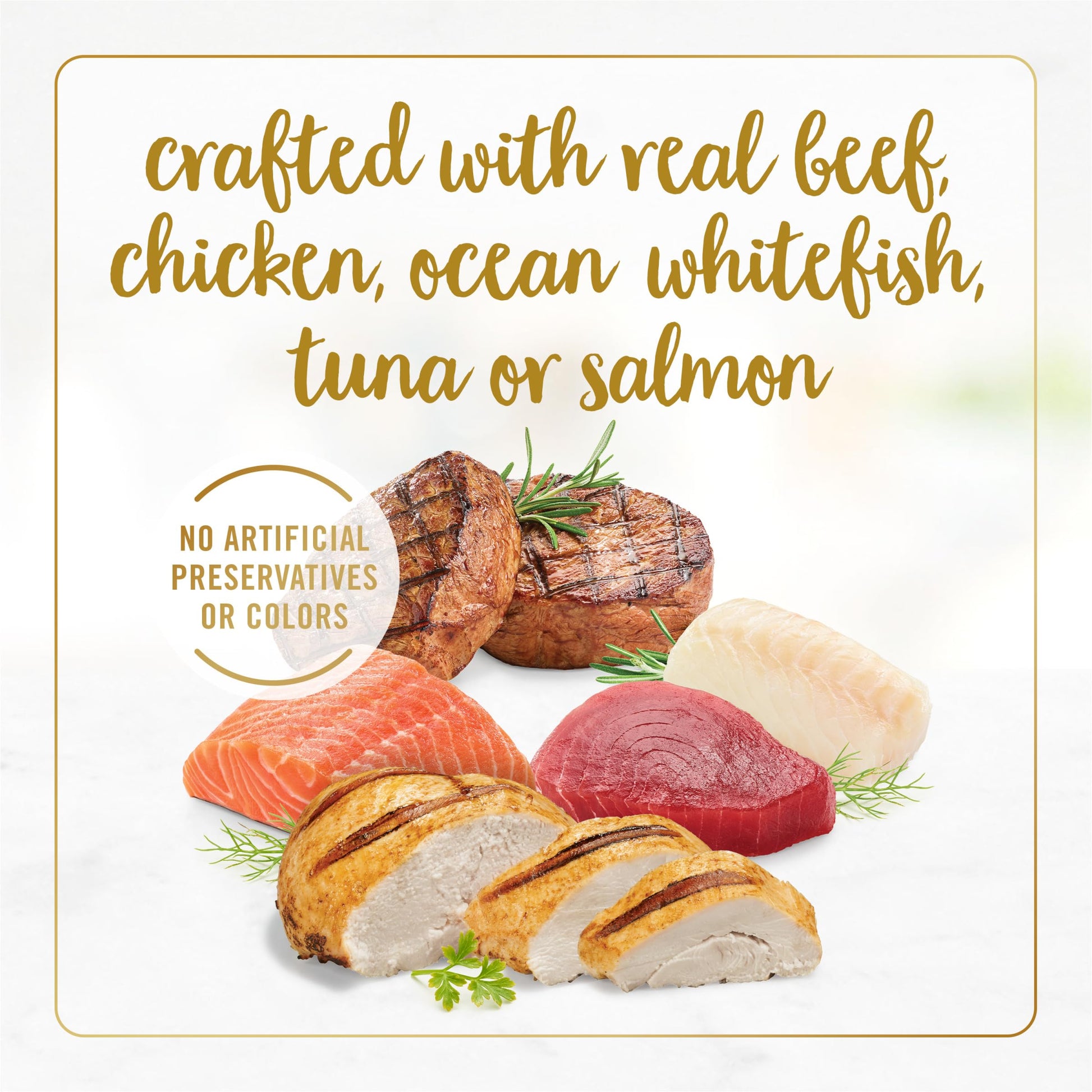 • Wet cat food variety pack featuring formulas crafted with real beef, chicken, ocean whitefish and tuna, or salmon with no artificial preservatives or colors