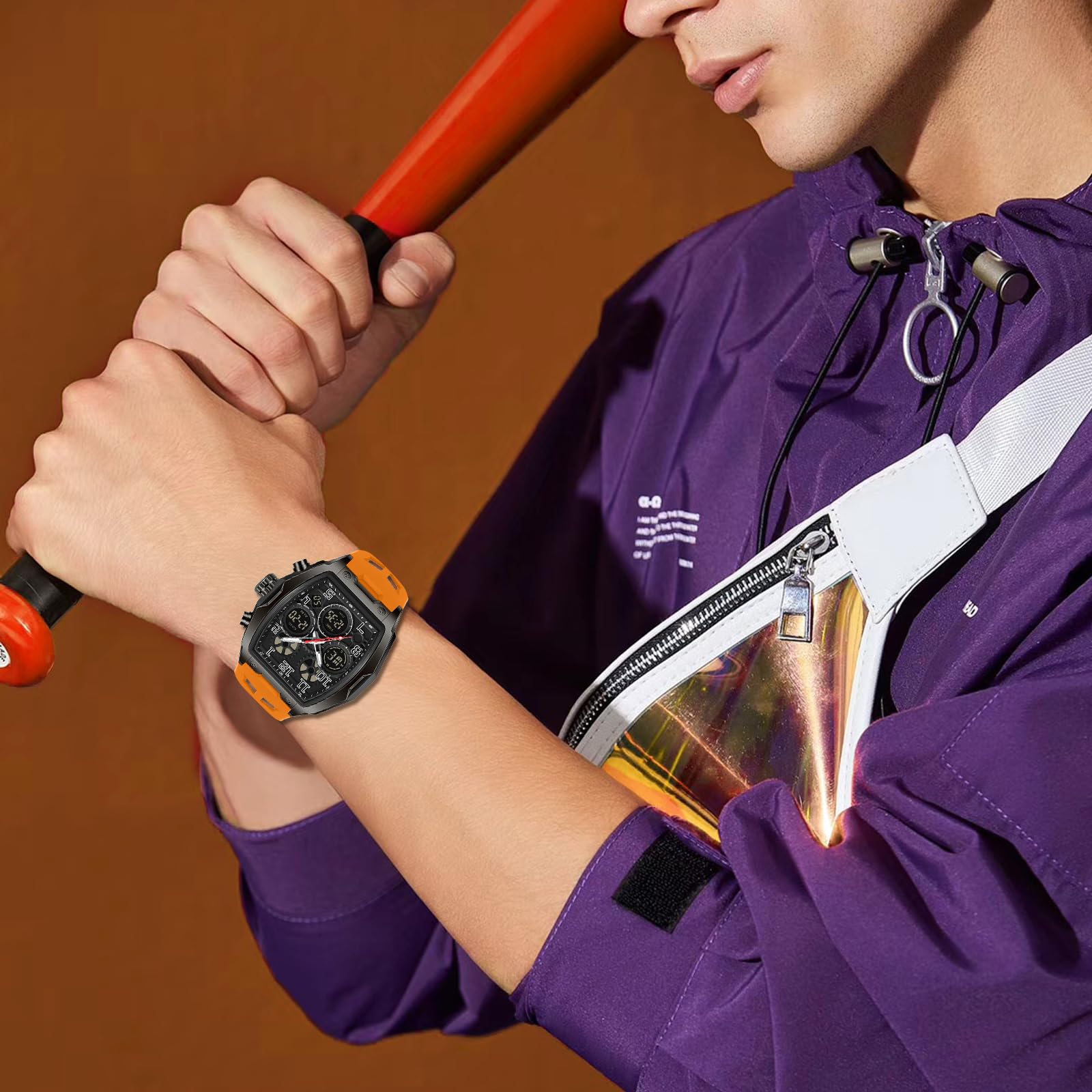 FANMIS Watch for Men Fashion Hollow Unique Rectangle Dial Wristwatch Waterproof Sport Digital Analog Dual Time Display Stopwatch Punk Cool Design Silicon Strap Dress Watch (Orange)
